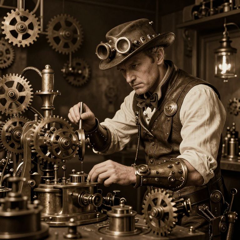 A digital illustration depicts a bearded, mustachioed man in a steampunk-style brown leather vest and matching hat, standing in a cluttered, dimly-lit workshop. He is adjusting a complex, metallic machine with a smoking pipe in his right hand. The workshop is filled with various gears, cogs, and brass fixtures on shelves in the background. The man wears a white shirt with rolled-up sleeves, a pocket watch chain, and a brass compass on his vest. The image has a warm, sepia-toned color palette, emphasizing the industrial, vintage atmosphere.