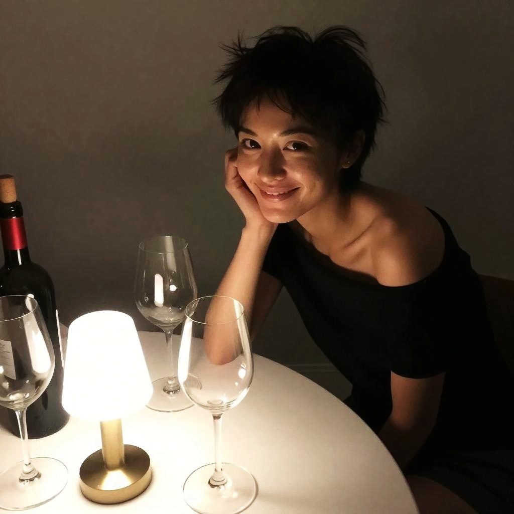 Woman with short, dark, spiky hair, wearing a black off-shoulder top, smiling at camera, leaning on table. Table has a lit lamp, two wine glasses, and a wine bottle. Dimly lit background. Casual, intimate setting.