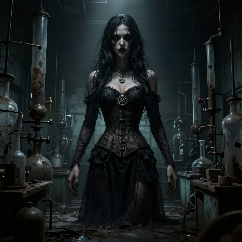 ASCII ASCII 8K, (score_9), score_8_up, score_7_up, ((realistic, hyperdetailed, realism)), humongous, girl in a corset with with a pentagram medallion standing in an old dilapidated chemical laboratory . Eerie, unsettling, dark, spooky, suspenseful, grim, highly detailed