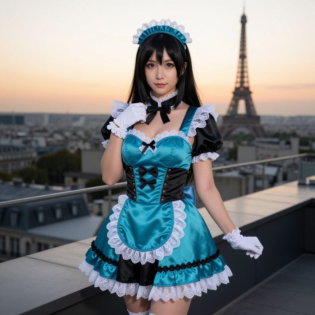 Photograph of a young Asian woman in a turquoise and black French maid costume with white lace, standing on a Paris rooftop at sunset, with the E