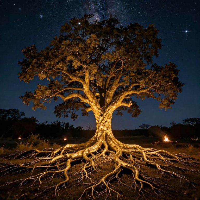 Roots of gold weave beneath the earth, mirroring the cosmos above, as the tree stands as a beacon of serenity, its branches reaching toward the stars, cradled by the whispers of night and the warmth of unseen fires.