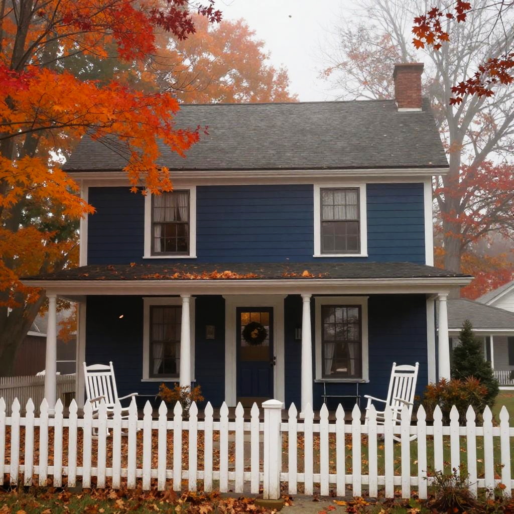 Navy house with white trim nestled in a lush green garden, vibrant flowers blooming around, bright sunny day, detailed textures on wooden siding and crisp white trims, cozy front porch with hanging lanterns, charming suburban neighborhood style.