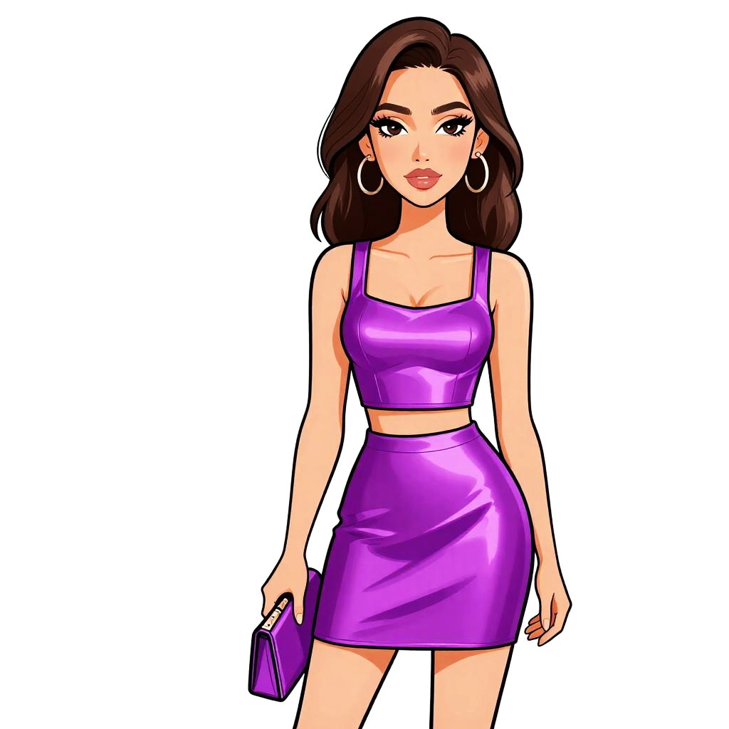 Woman with pretty face and pretty hair. Woman, glam, metallic threaded halter crop top, high neckline, sleeveless, pale pink skater skirt, mini length, gold-toned cuff bracelet, holding a textured clutch with a metallic sheen. --sref 1467