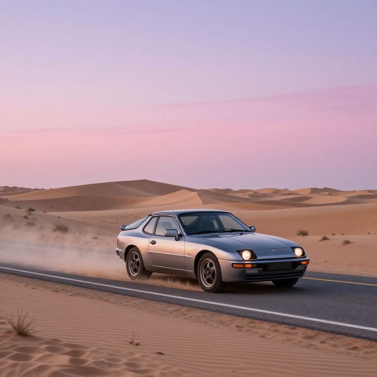 Porsh 944 cruising through a desert highway at dawn, soft pink and purple sky blending with endless sand dunes, dust trail behind the car, rugged yet sleek appearance, capturing the essence of freedom and adventure in a vast natural landscape