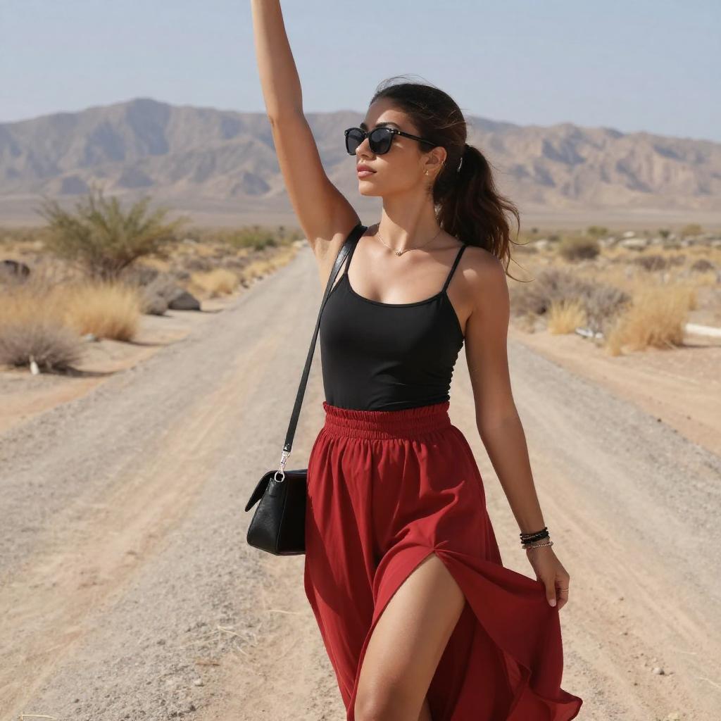 Photograph of a young woman with light brown skin and long dark hair in a ponytail, wearing sunglasses, a black spaghetti-strap top, and a high-waisted, red, flowy skirt with a thigh-high slit. She stands on a dusty, desert road, raising her right arm, with a black crossbody bag and multiple bracelets on her left wrist. The background features dry, grassy terrain and distant mountains under a clear blue sky.