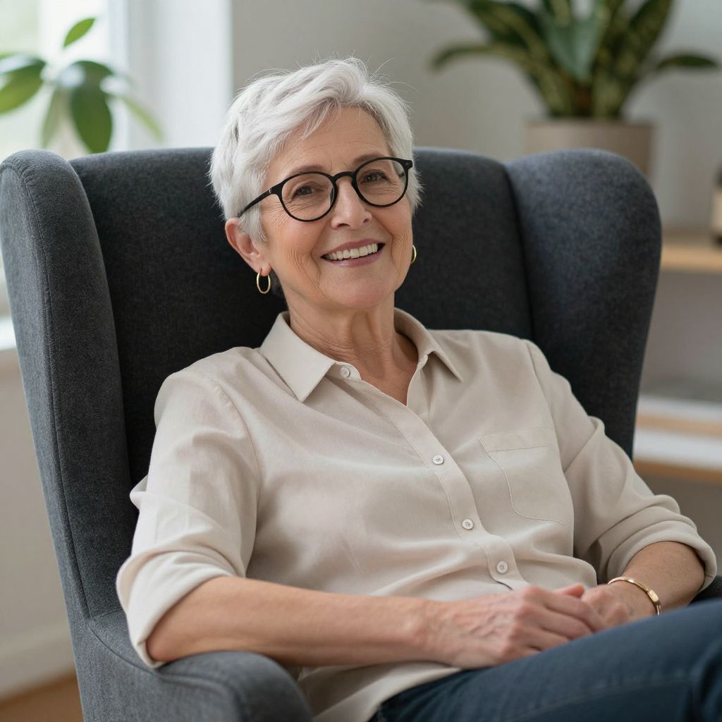 Smiling mature woman with short white hair and glasses relaxes in a dark gray armchair, wearing a light beige button-up shirt and gold hoop earrings, surrounded by a cozy indoor setting featuring green plants and soft natural lighting.