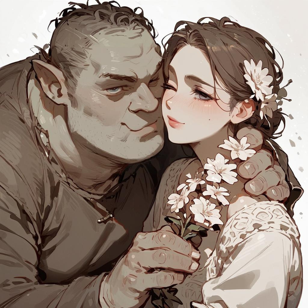 Score_9, score_8_up, score_7_up, source_furry, source_ anime, lineart, sketch, shrek, skin, holding flower, one eye closed, imminent kiss
