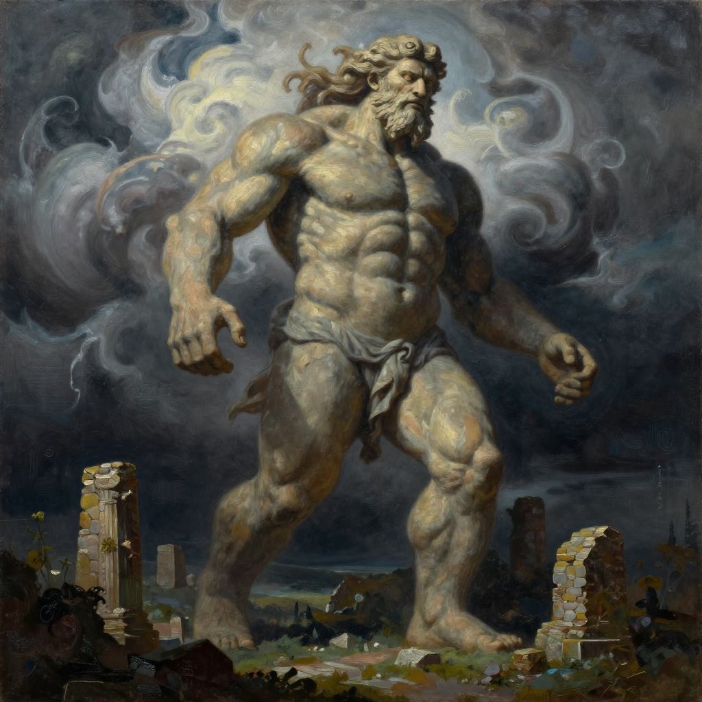 A digital painting depicts a towering, muscular, bearded Zeus-like figure with a stone-like texture. He has a commanding presence, with a massive, defined physique, and wears only a simple loincloth. His long, wavy hair and flowing beard are illuminated by swirling, ethereal white clouds against a dark, stormy sky. He stands amidst ruins of crumbling stone pillars, with a distant cityscape visible beneath him. The painting uses dramatic contrasts of light and shadow, emphasizing the divine and powerful nature of the figure. The style blends realism with a fantastical, mythological aesthetic.