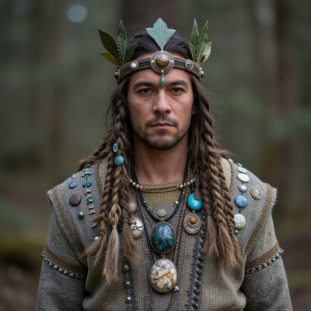 A detailed portrait of a man dressed in tribal or fantasy-inspired attire, standing in a forest setting. He wears an elaborate headpiece with leaves and braided hair, along with layered clothing adorned with various natural ornaments and stones, evoking a mystical and ancient vibe.