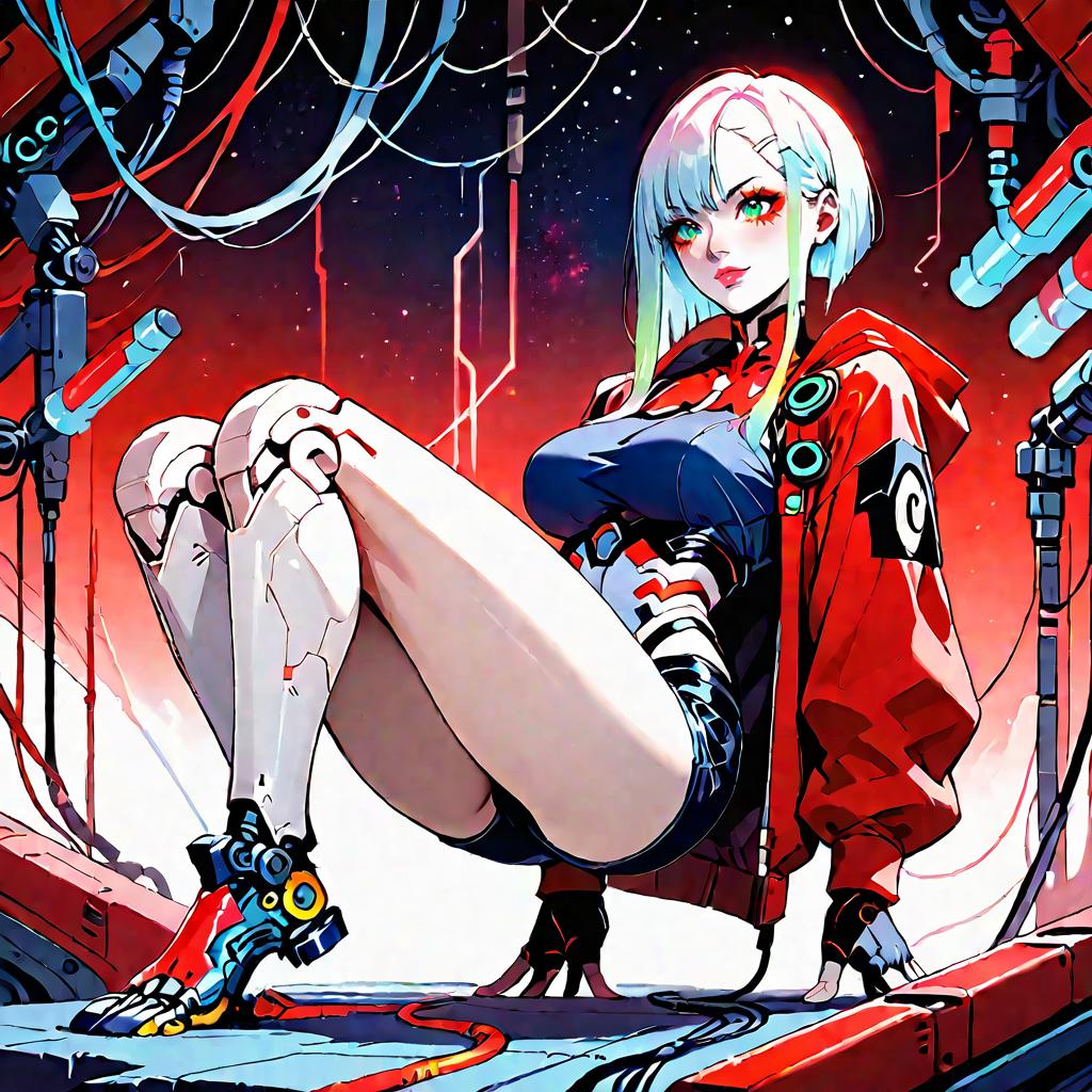 Score_9, score_8_up, score_7_up, robot girl, Lucy (Cyberpunk: Edgerunners), squatting, (full body, mechanical toes:1.2), back view, (robot joints, intervention unit, very complex robot, glowing che BREAK 1.2), solo, large breasts, bangs, arched back, dark eyes, too tight burgundy hoodie, provocative, cosmic background, cables and wires everywhere, smirk, red theme, covered face, carbon tank top, fingerless gloves, female figure, large breasts, arched back, dark eyes, bangs, smirk, tight burgundy hoodie, carbon fiber tank top, fingerless gloves, covered face, red theme, cosmic background, cables and wires, futuristic, cyberpunk, high detail