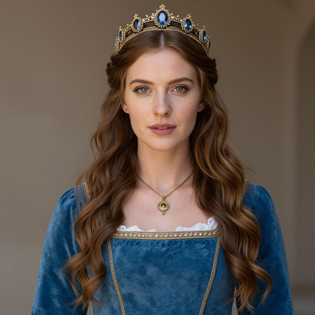 Photograph of a young woman with fair skin and long, wavy brown hair, wearing a blue velvet dress with white lace trim and gold embroidery. She has blue eyes and wears a gold and blue jeweled tiara. Her makeup is subtle, with light pink lipstick. She is also wearing a gold necklace with a small, intricate pendant. The background is blurred, featuring neutral tones, focusing attention on her. The overall style is regal and elegant, reminiscent of a fairy tale princess. The image is well-lit, highlighting her serene expression.