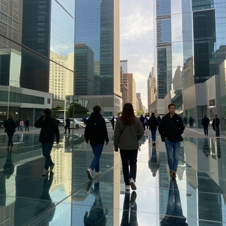 Photograph of a busy urban plaza with reflective glass walls, people walking, tall skyscrapers, and bright sunlight creating dynamic reflections.