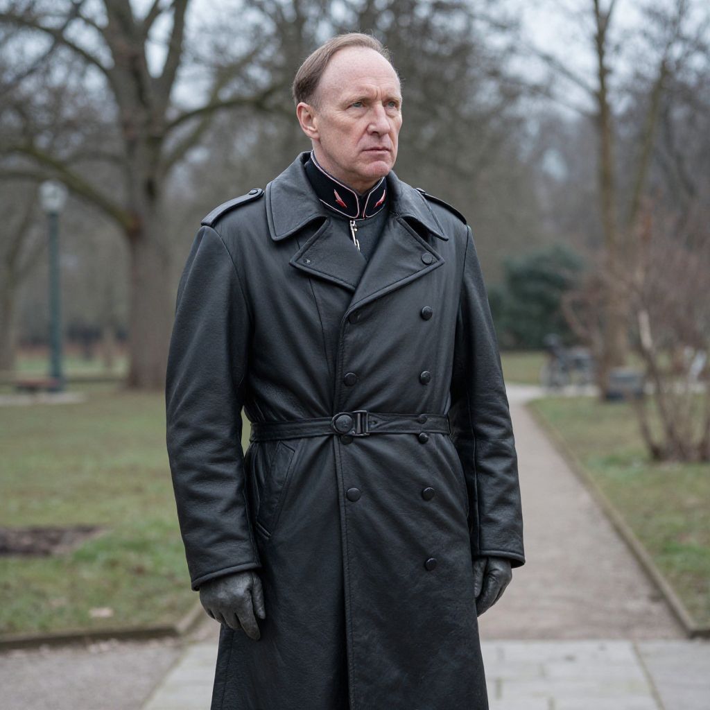 Sculpture Garden Ralph Fiennes as a german colonel in the 1940s, wearing a black leather coat. Gritty image style.,