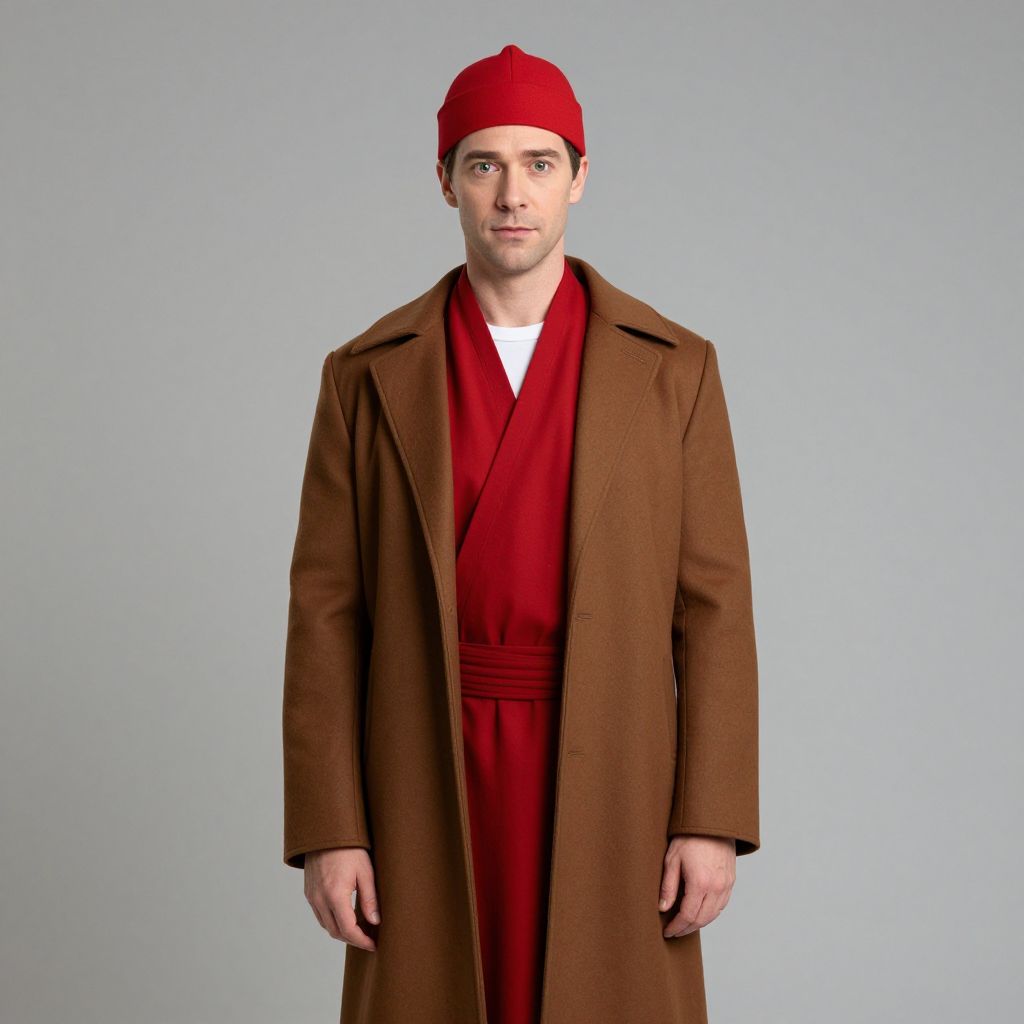 Photograph of a Caucasian man with fair skin and short brown hair, wearing a bright red beret, red kimono-style robe, and a brown, long, woolen overcoat. His expression is neutral, and he stands against a plain, light gray background. The overcoat's texture appears thick and slightly rough, contrasting with the smooth fabric of the red robe. His white shirt peeks out from under the robe, adding a subtle contrast to the otherwise monochromatic red and brown color palette. He stands facing forward, centered in the frame.