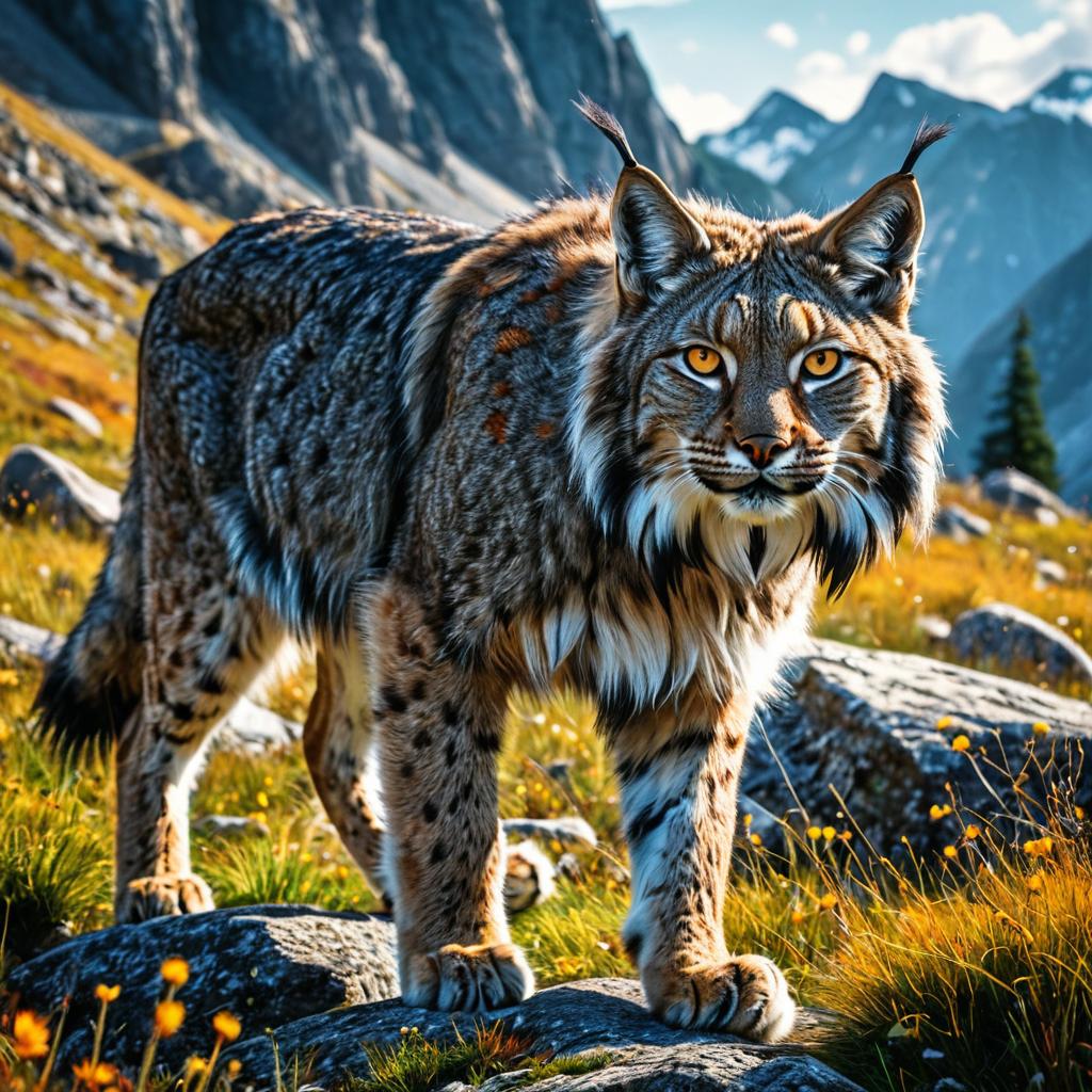 A detailed and realistic image of a feral lynx with tufted ears and amber eyes, prowling through a rocky alpine meadow. The lynx features a thick billowing mane, glistening black and brown fur, and unsheathed claws. The background includes vibrant wildflowers, rocks, and distant snow-capped mountains under a bright sky, rendered in an epic oil painting style with vivid complementary colors.