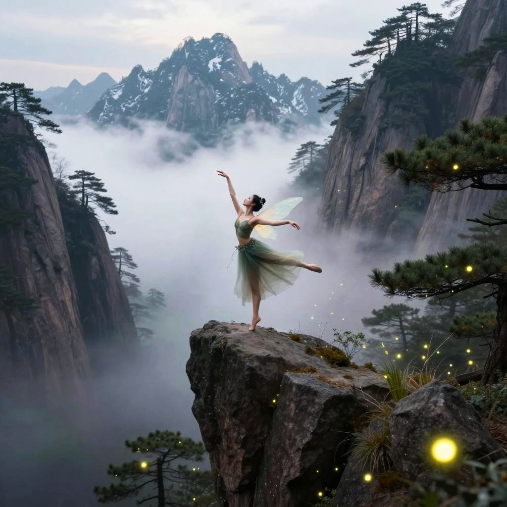 Mystical mistymountainfairy dancing gracefully above jagged mountain cliffs enveloped in swirling clouds and mist, surrounded by glowing fireflies and ethereal floating lights, fantasy landscape with towering pine trees and distant snow-capped peaks, enchanting and mysterious mood.