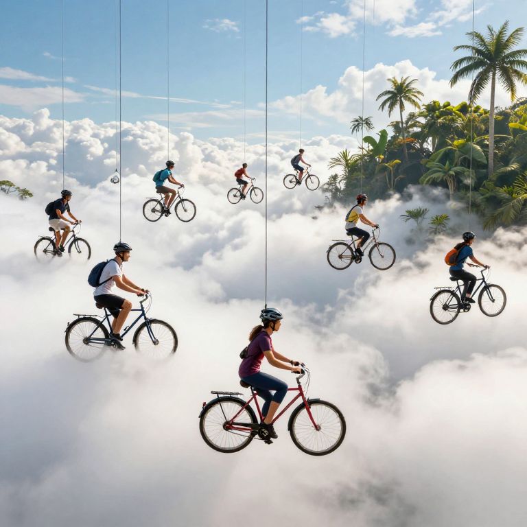 A jungle of suspended bicycles weaves through the clouds, each one gently humming with the memory of its last rider.
