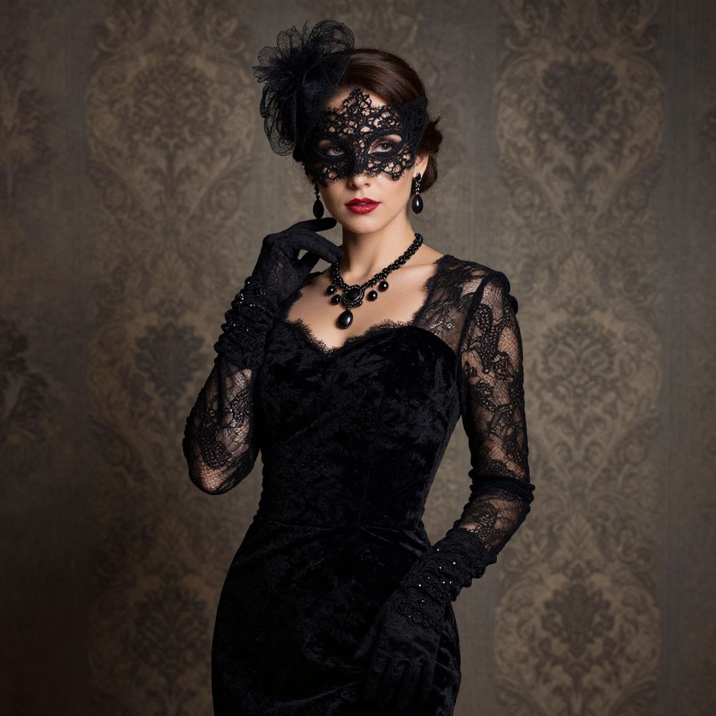 Elegant woman dressed in a vintage-inspired black velvet gown with intricate lace sleeves and gloves. She wears a black lace mask and a matching lace headpiece, complemented by a statement necklace and earrings. The photo has a moody and mysterious atmosphere with a textured, patterned wallpaper background, evoking a vintage, high-fashion aesthetic reminiscent of Guy Bourdin's style.