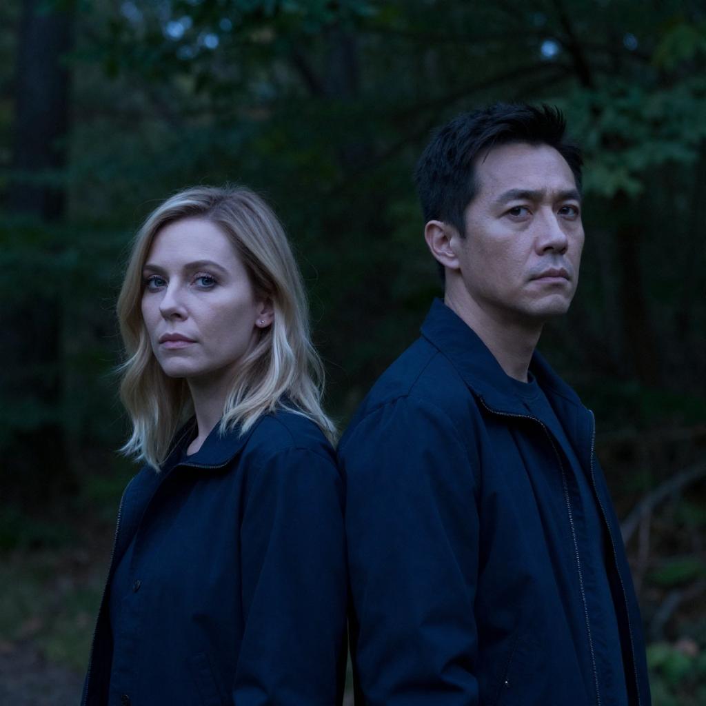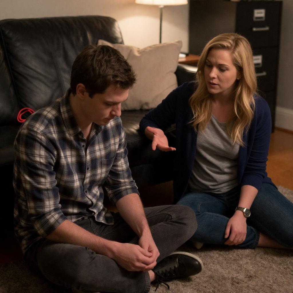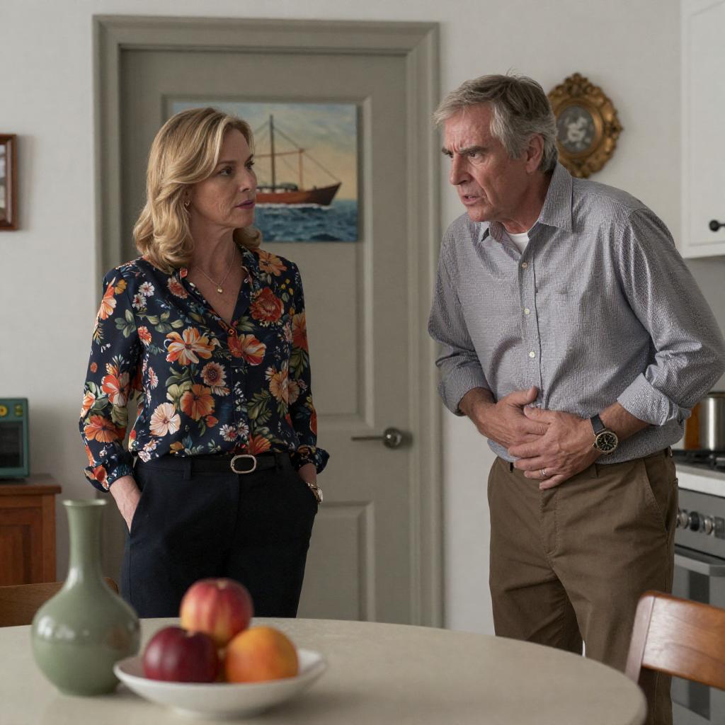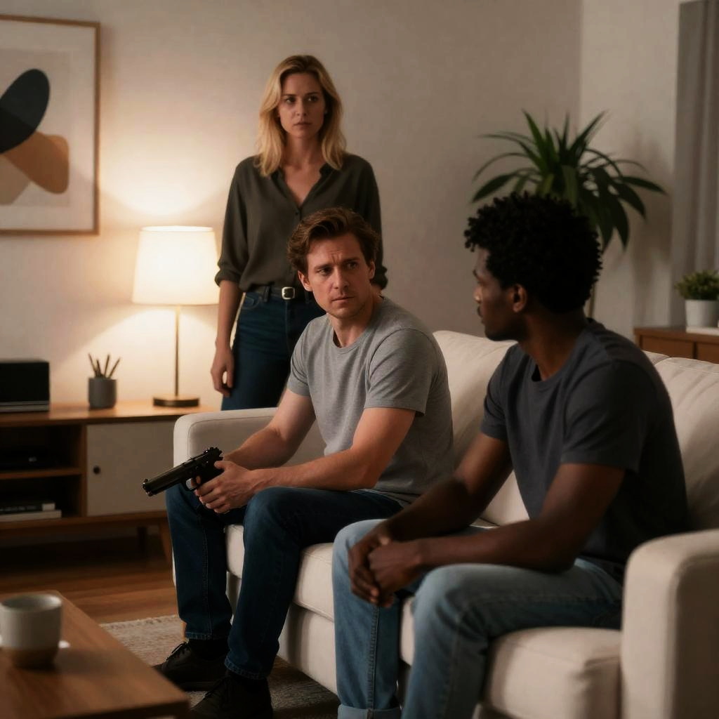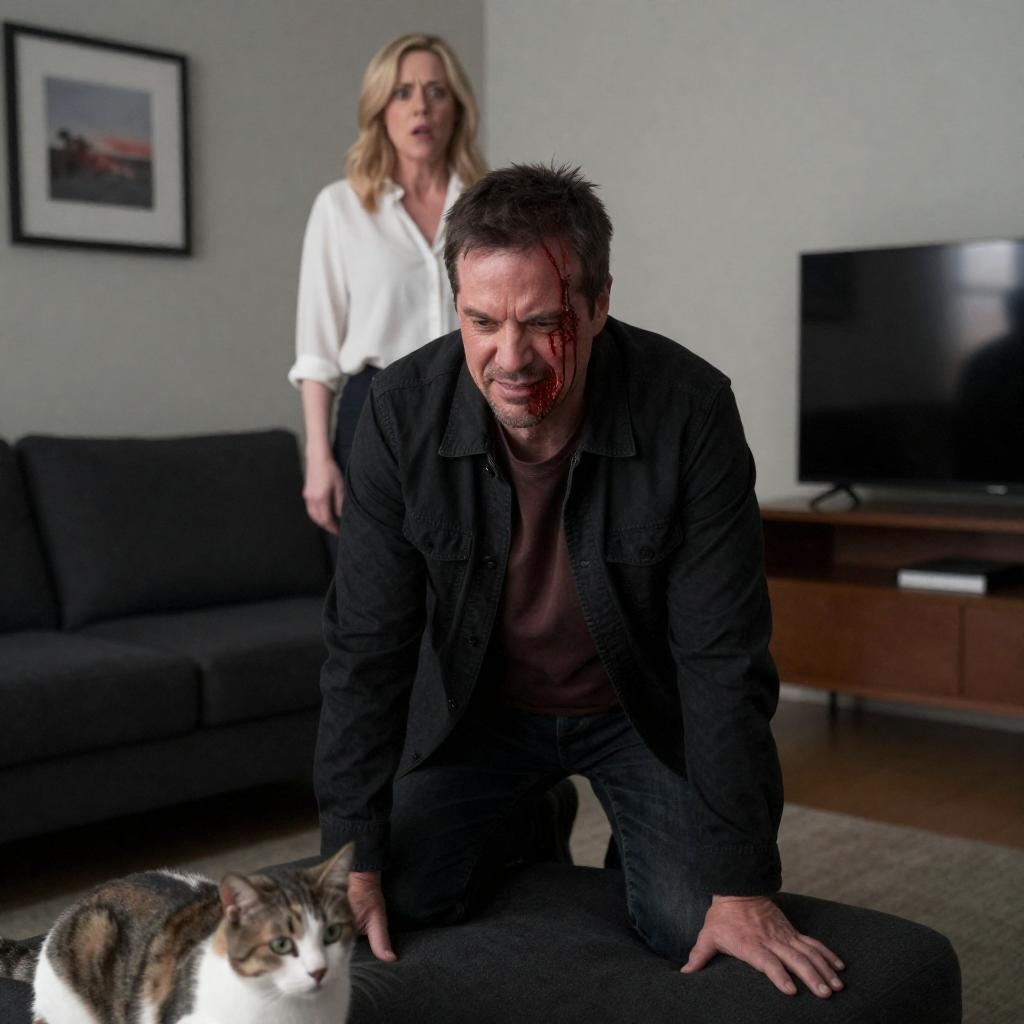 A tense scene from a movie: a middle-aged man with short dark hair, wearing a black jacket over a brown shirt, kneels on a couch, grimacing with blood on his face. A woman with blonde hair and a white blouse stands behind him, looking shocked. A cat lies on the couch in the foreground. The room has a black couch, framed picture, and a TV on a stand.