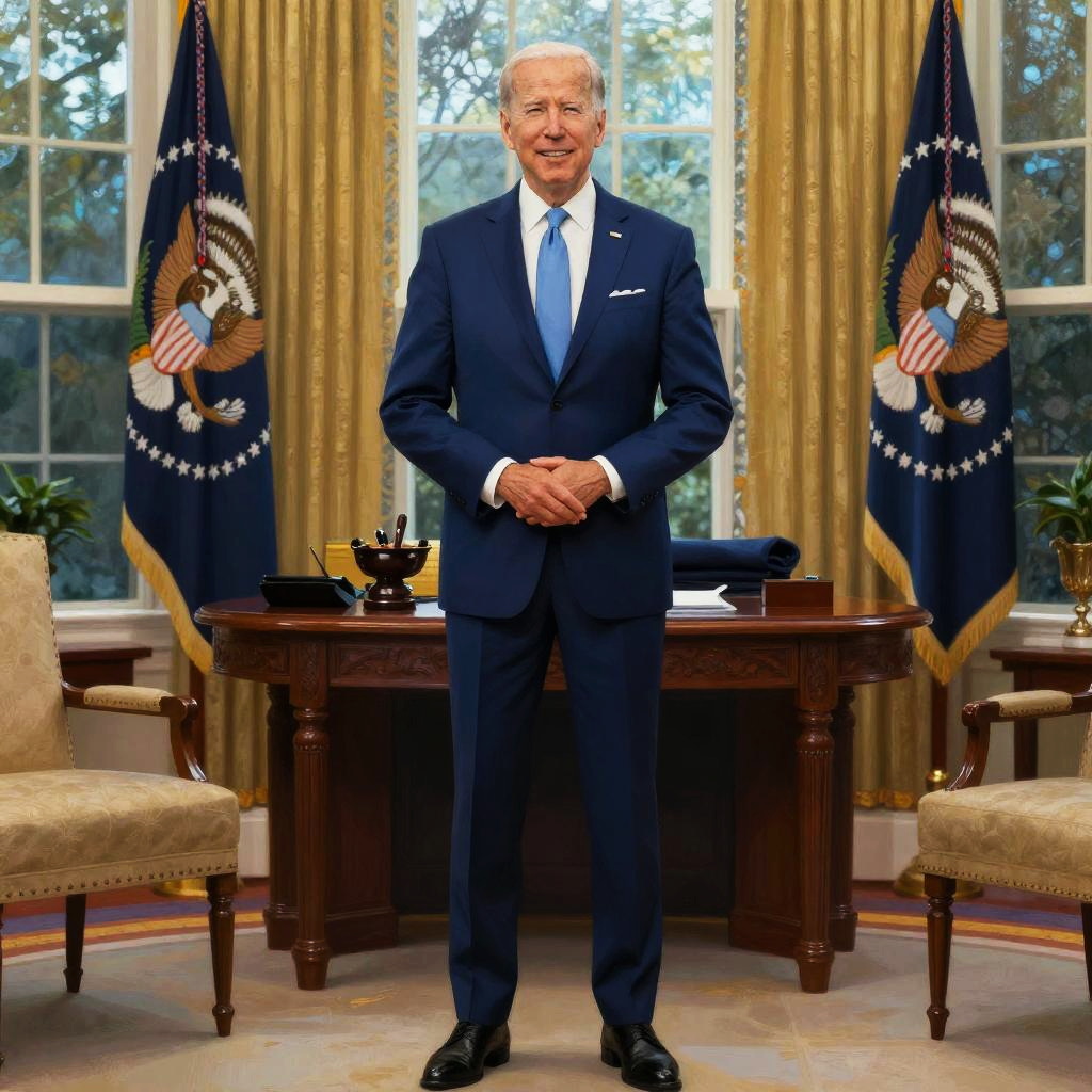 Biden full body figure in a presidential office setting, wearing a dark blue suit with a tie, confident pose with hands clasped, warm ambient lighting, hyper-realistic digital painting style with rich color depth.