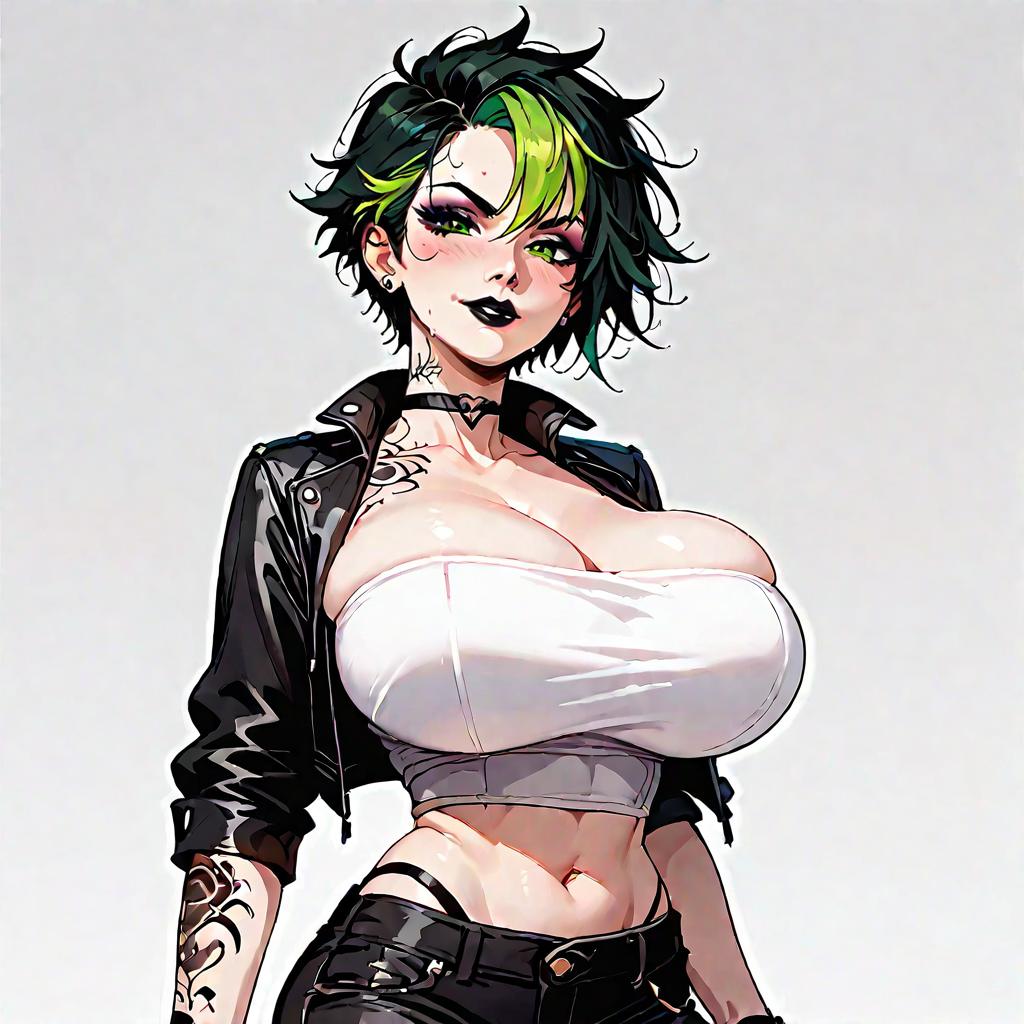 Score_9, score_8_up, score_7_up, score_6_up, score_5_up, score_4_up, rating_safe, girl with black hair, short hair, messy hair, tomboy, neon green eyes, black eyeshadow, multicolored hair, neon green hair, black lips, looking at viewer, smug, adult, mature, solo, standing, skinny, black tube top, black punk jacket, black choker, large breasts, strapless, stomach, black shorts, top pull, bursting breasts, green pubic tattoo, black background, simple background