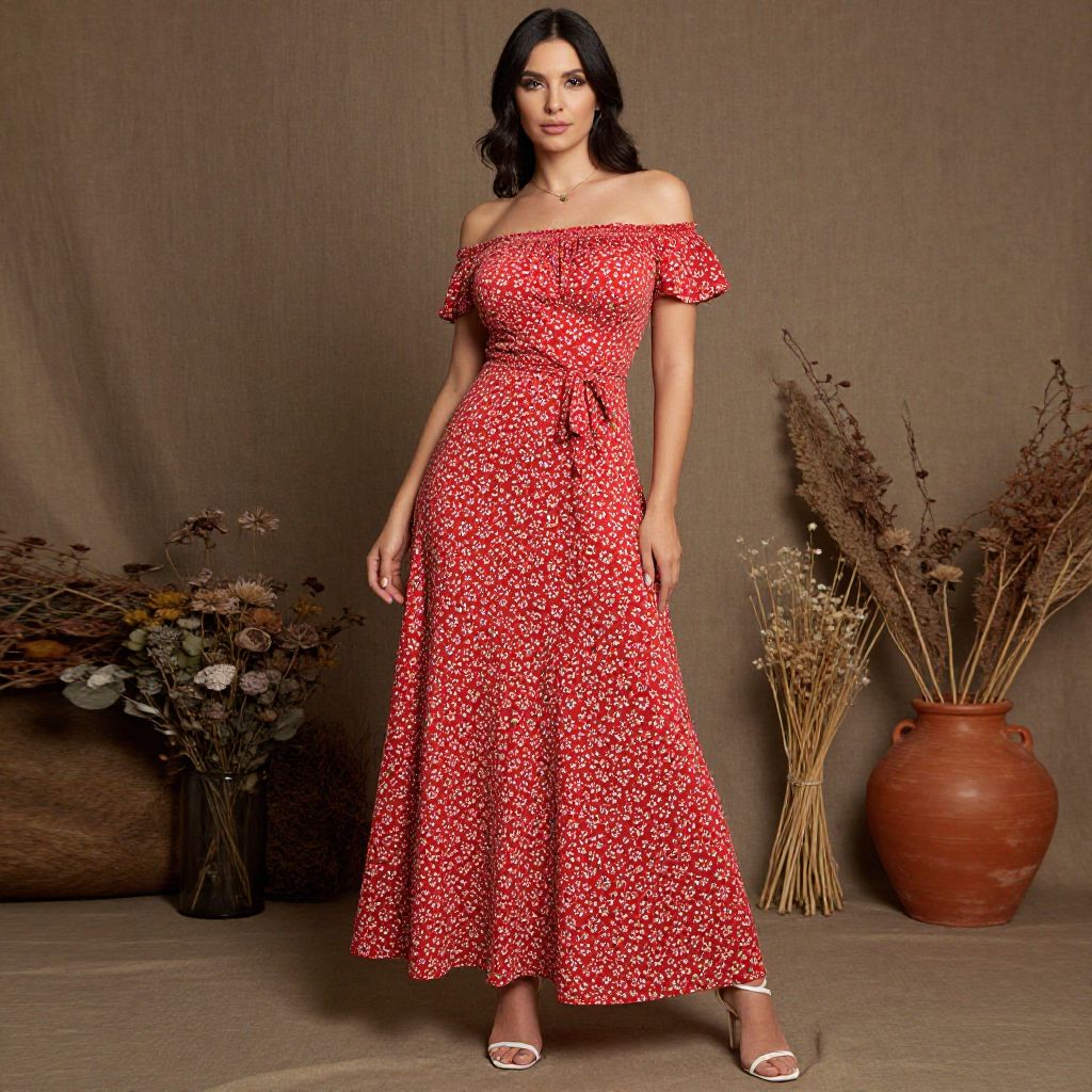 "Woman, romantic bohemian, red maxi dress with white floral pattern, off-the-shoulder neckline with ruffle detail, short flutter sleeves, cinched waist, full-length skirt, white strappy heels, minimal jewelry, studio backdrop with dried floral arrangements and terracotta pot. Sexy. Pretty face and beаutiful eyes. Big breasts."