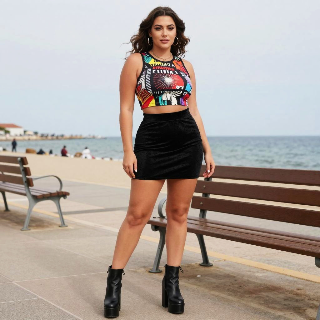A Curvy woman, in a madhouse visual style, wearing a cropped tank top with a bold graphic print and a high-waisted black velvet mini skirt, stands on a seafront promenade with benches, her platform ankle boots adding to the vibrant atmosphere. Sexy. Pretty face and beutiful eyes