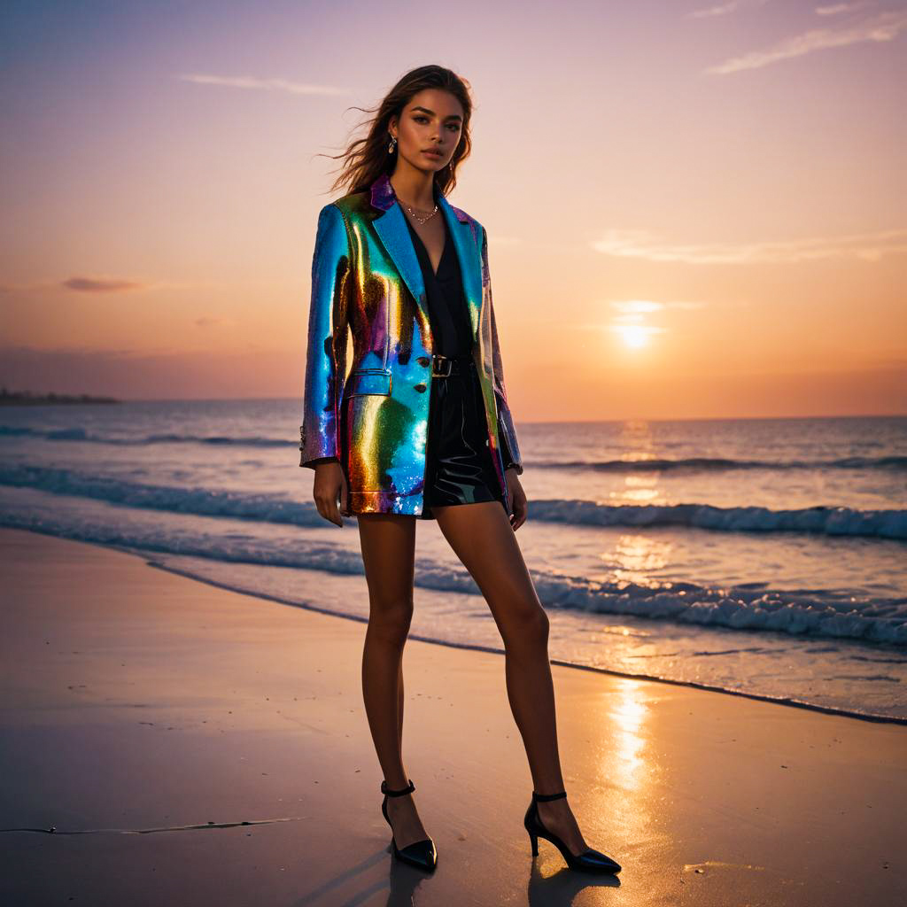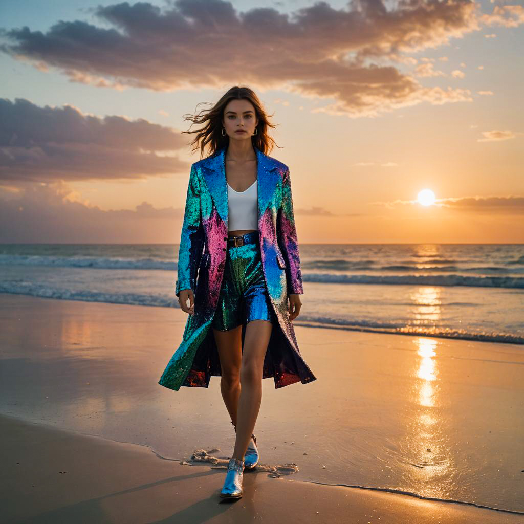 Slim young woman walking confidently on a beach at sunset wearing a colorful, sequined long coat and matching shorts over a white top. The dramatic golden hour lighting highlights the reflective textures of the outfit and the waves in the background, creating a cinematic and high fashion look.