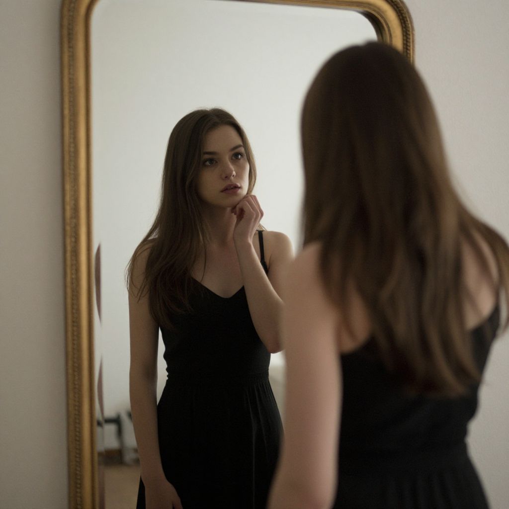 In a room where time bends and reflections blur the line between self and shadow, a young woman stands before a mirror that mirrors not just her form, but the silent whispers of her soul.
