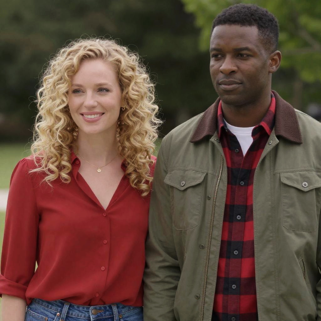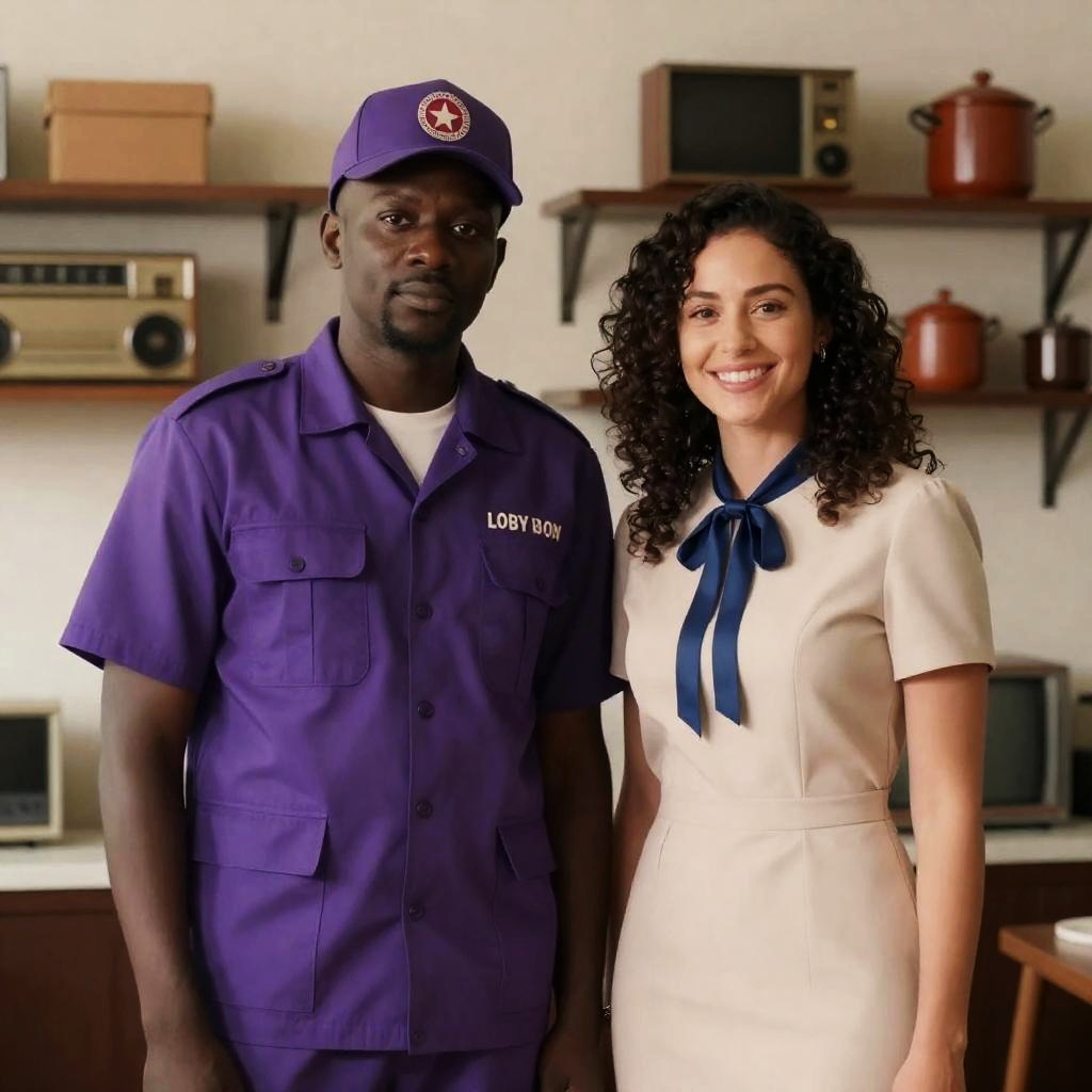 Photograph of two people standing in a workshop. Man in purple uniform with "JOBBY BOY" hat, dark skin, serious expression. Woman with light skin, blonde hair, gray dress with blue ribbon, necklace, intense expression. Background has shelves with helmets and tools. Wooden table in foreground with small toy figurines.