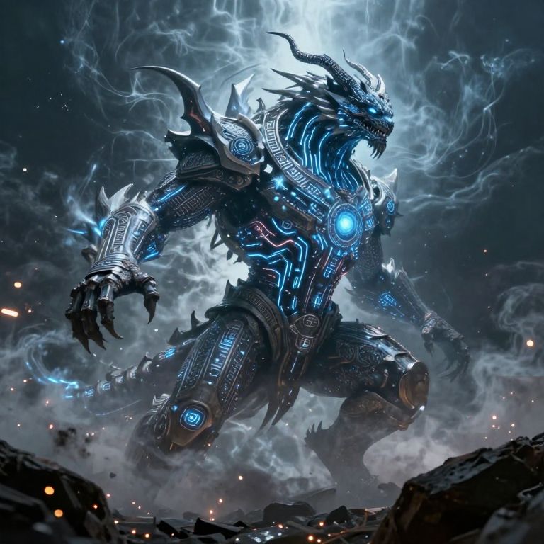 Epic AI art depicting a colossal mythical creature emerging from a digital storm, glowing circuits intertwined with ancient runes, powerful and dynamic scene, intense lighting effects with smoke and sparks, blending fantasy and technology in a dramatic composition.