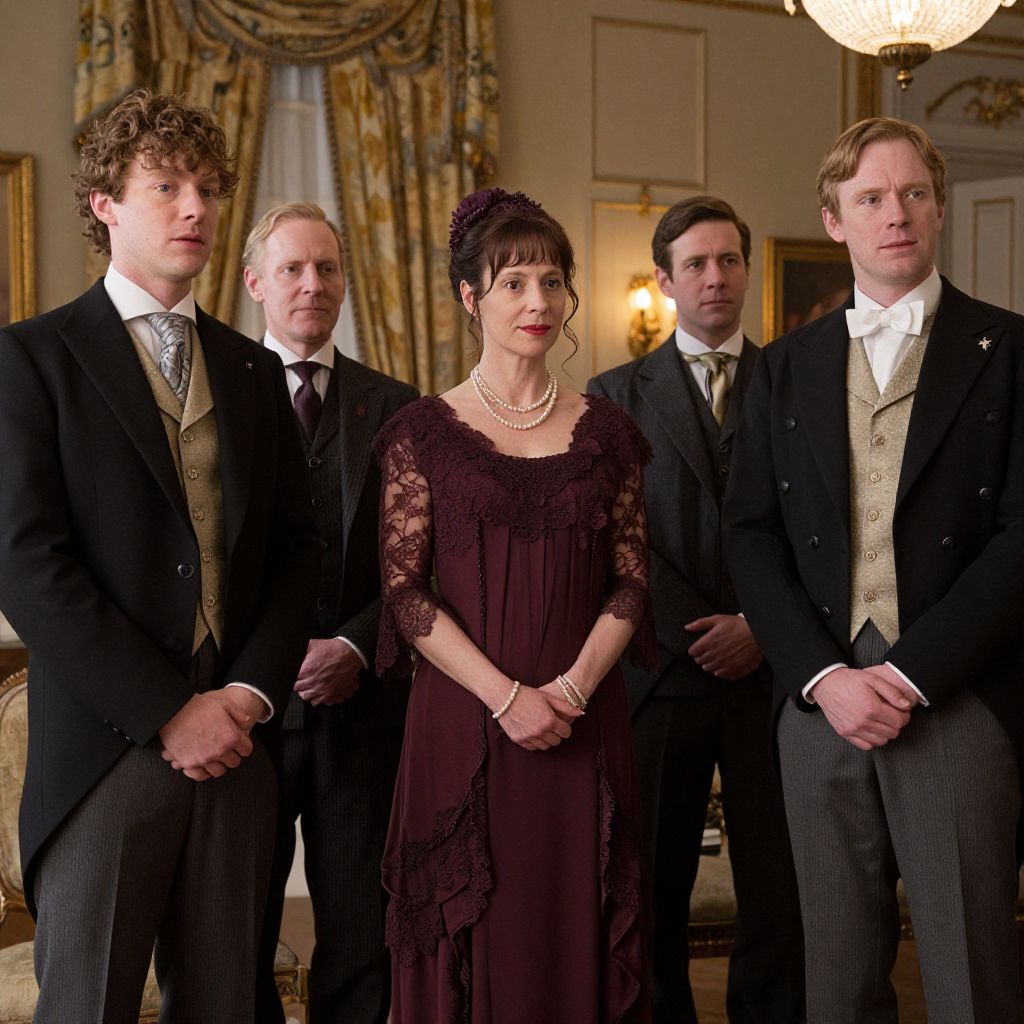 Elegantly dressed characters from *Downton Abbey* stand in a formal gathering, with a woman in a maroon gown adorned with lace and pearls positioned centrally, flanked by gentlemen in tailored suits and vests, all set against the backdrop of a grand, warmly lit interior featuring ornate curtains and a chandelier.