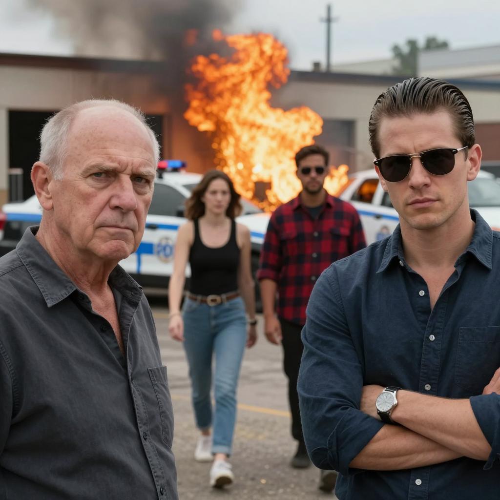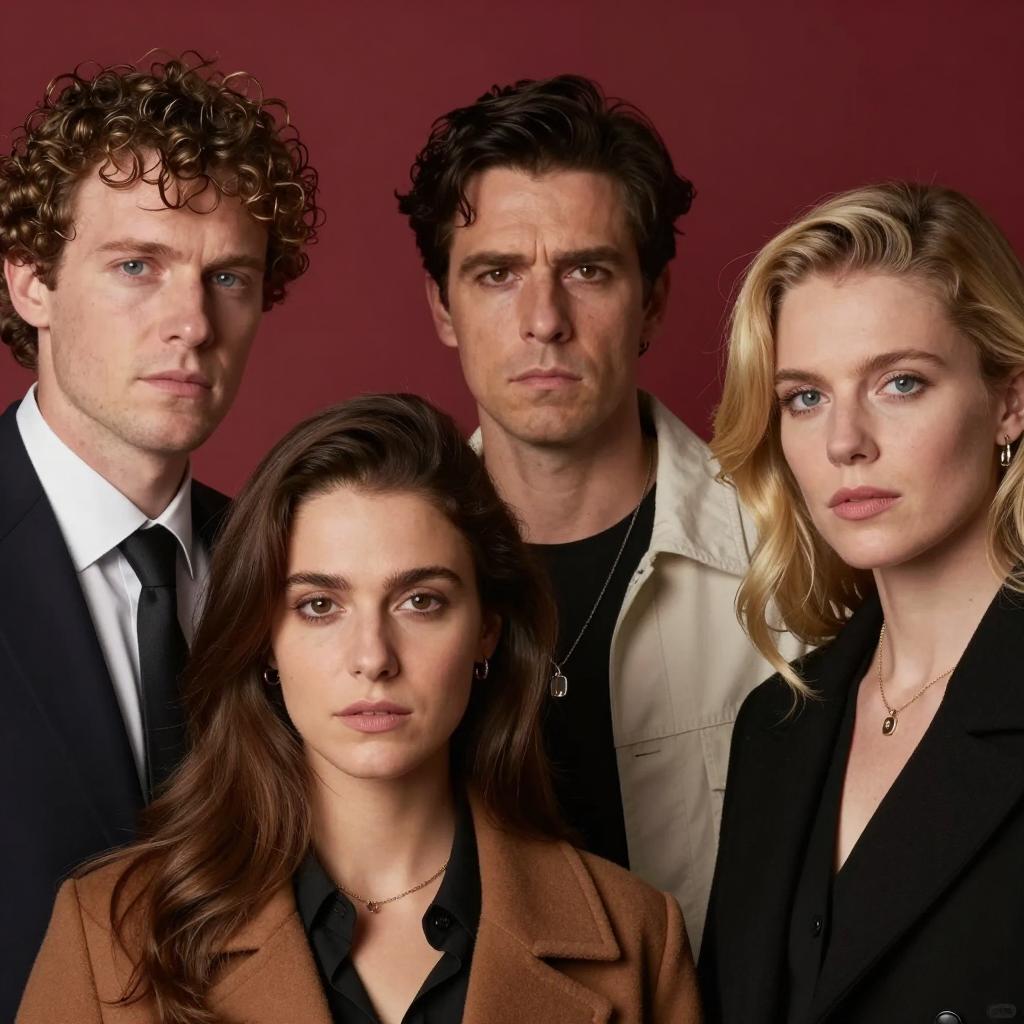Portrait of three light-skinned adults standing together. A red-haired woman in a beige coat and dark sunglasses is positioned behind an older man wearing a beige beret, dark sunglasses, and a dark jacket. A younger man with brown hair, dark sunglasses, and a black jacket smiles in the foreground. The group is dressed in fashionable dark clothing and sunglasses, posing against a dark background.