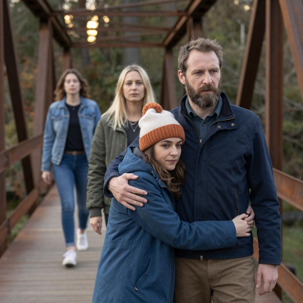 Photograph of three people outdoors near a tree. Young woman with long blonde hair, light blue denim shirt, and black pants stands with her head leaning against a bearded man in a green t-shirt and dark pants. Older man with gray hair, blue shirt, and black pants stands to the right, looking at them. Young man's hand on woman's back. Background includes a beige house with a window. Green leaves and branches in foreground.