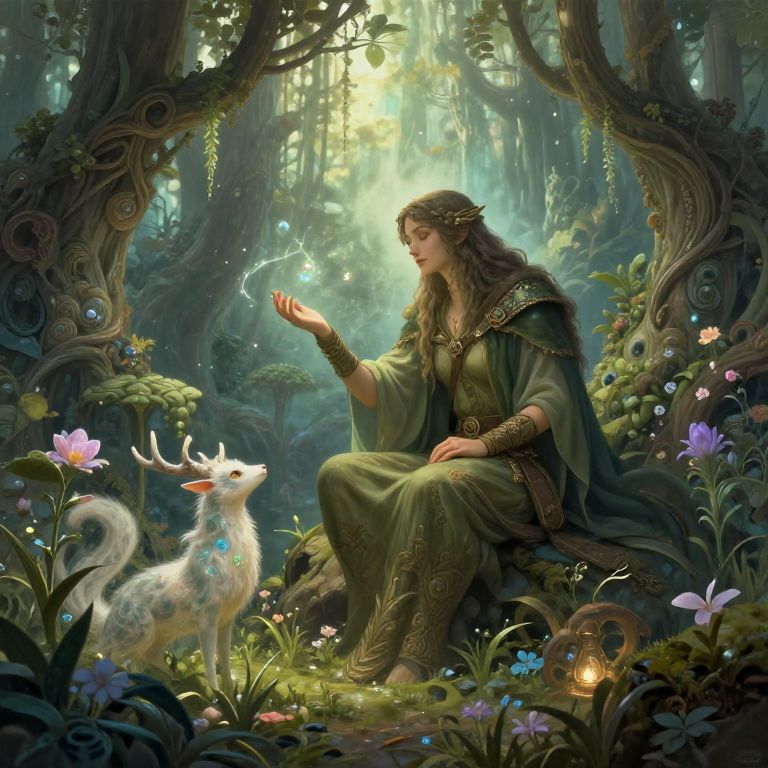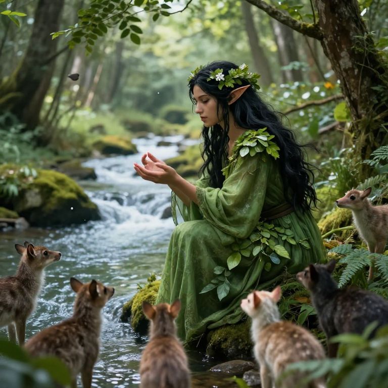 D&D black haired elf druid communing with nature beside a sparkling enchanted river, hair adorned with leaves and flowers, flowing green robes blending into forest surroundings, animals gathered nearby, serene and magical mood, detailed fantasy landscape.