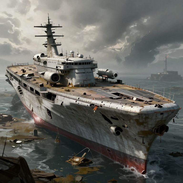 A post-apocalyptic, fantasy concept art of a dilapidated aircraft carrier with a realistic, scary atmosphere.