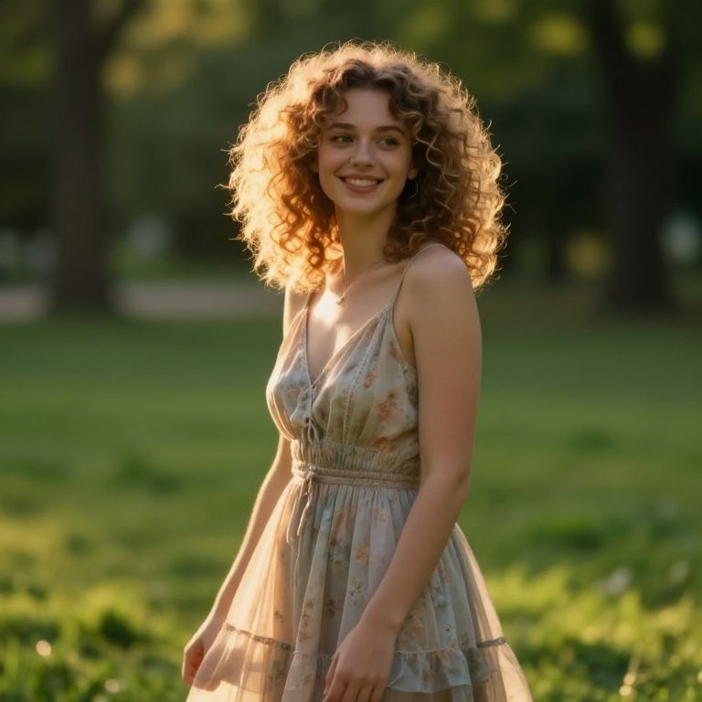 Curly hair white girl smiling confidently, wearing a flowy summer dress, golden hour light, lush green park setting, detailed texture on curls, cinematic and dreamy atmosphere