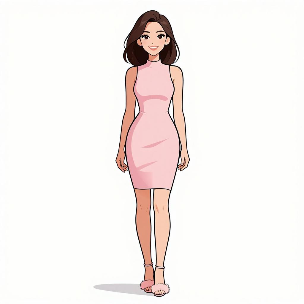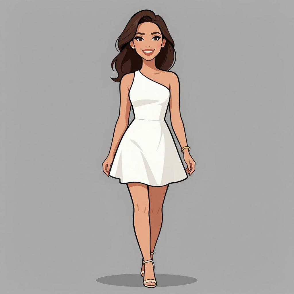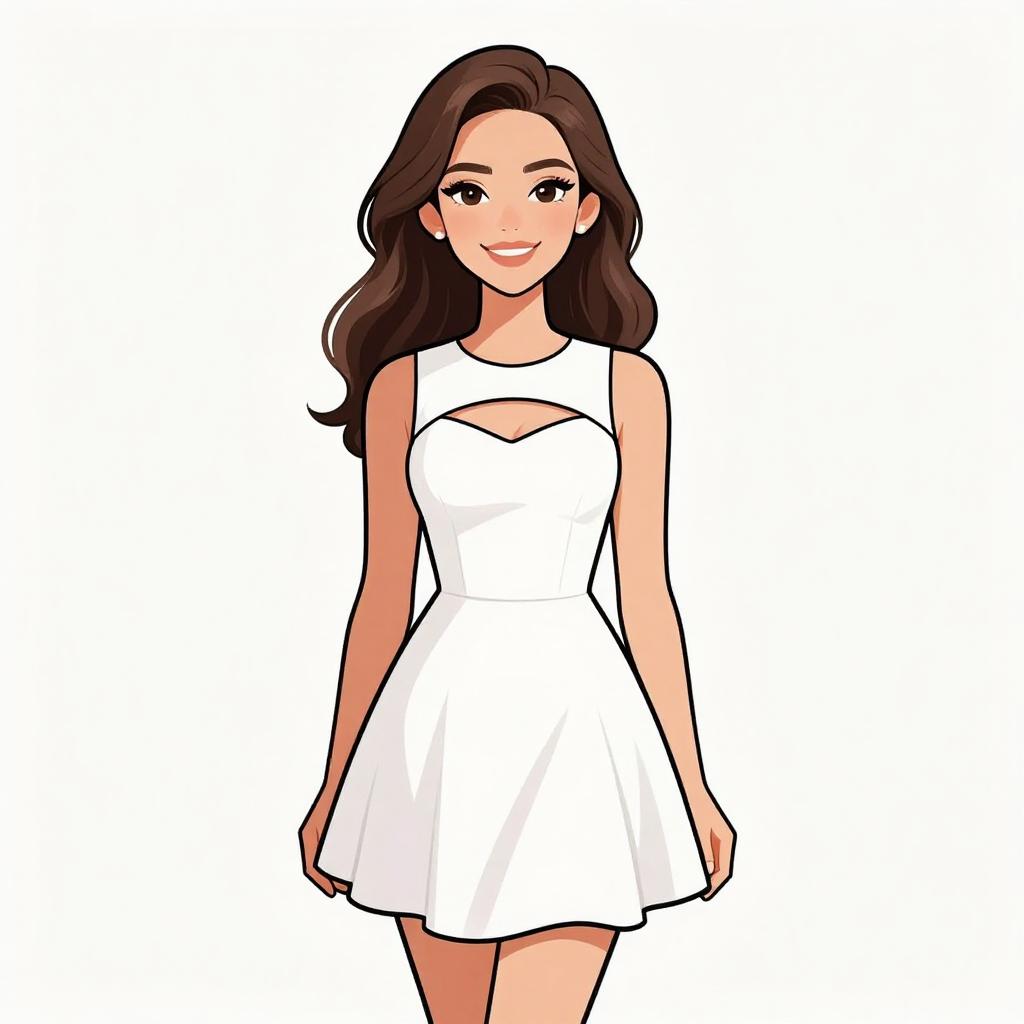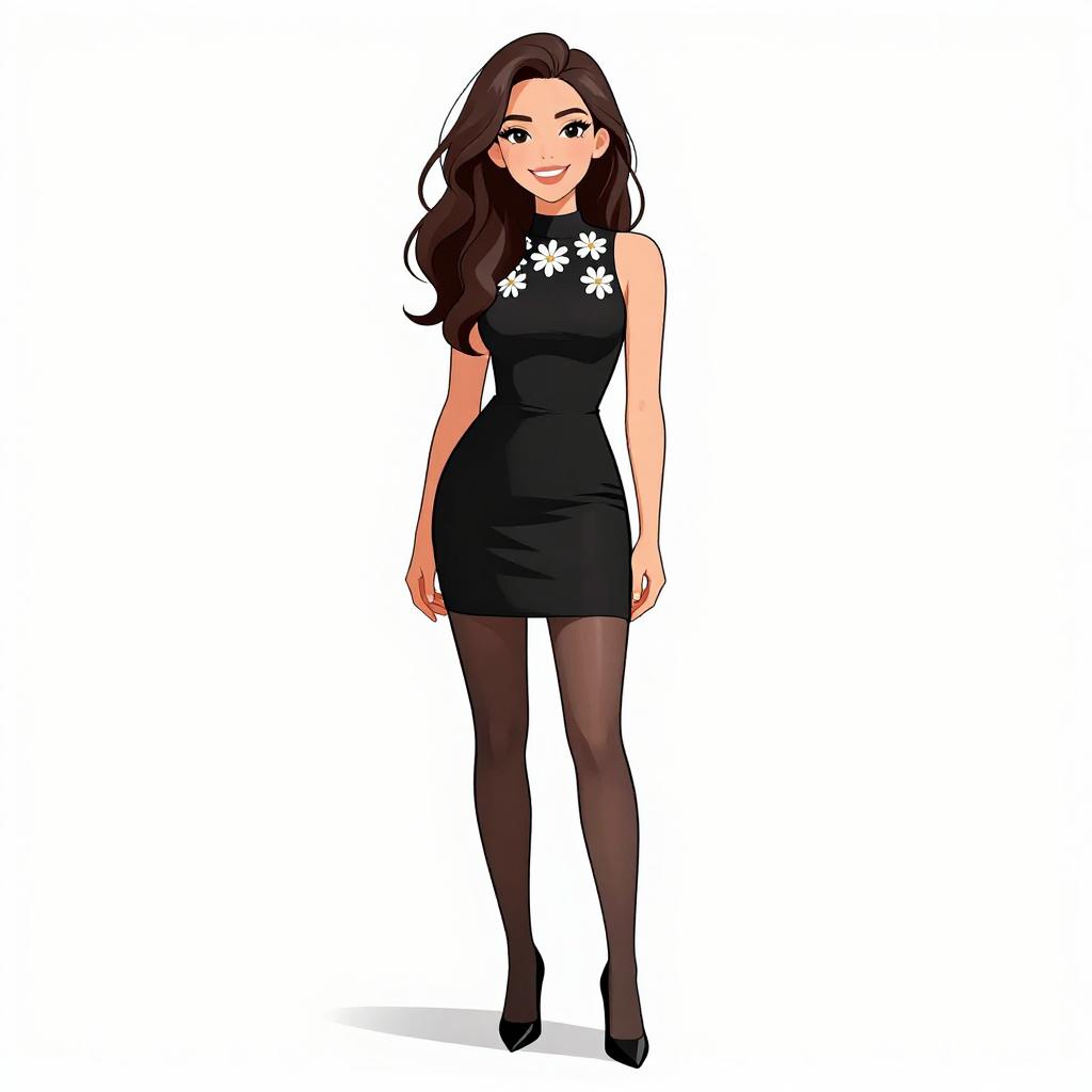 Woman with pretty face and pretty hair. smiling Woman, modern chic, black mini dress with white floral appliqué on the chest, high-necked, sleeveless, fitted silhouette, sheer black tights, classic black stiletto heels, plain white background. --sref 1467