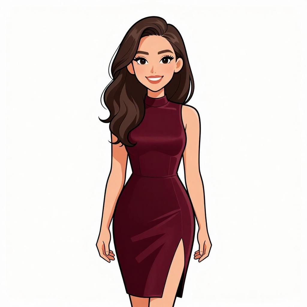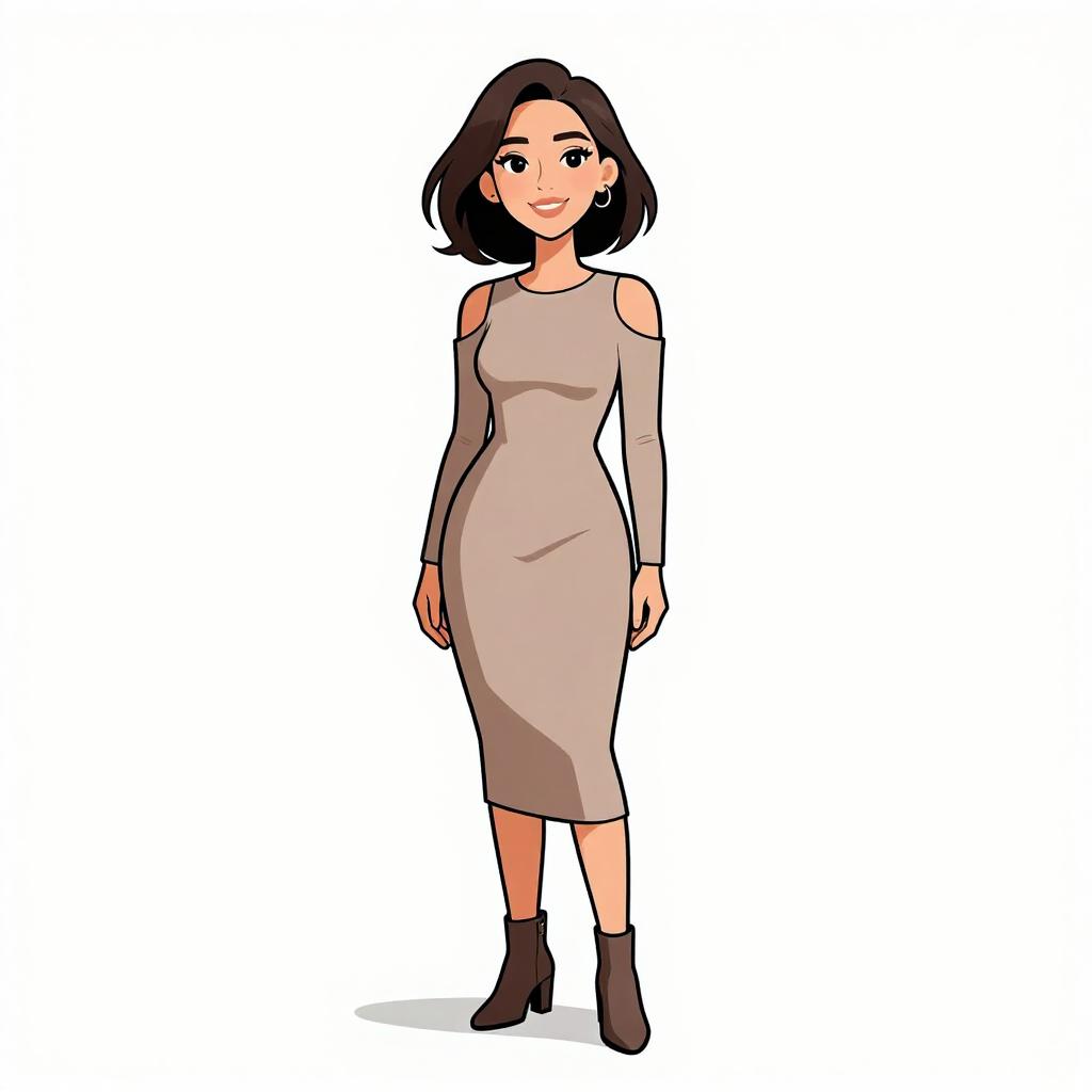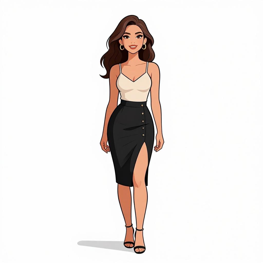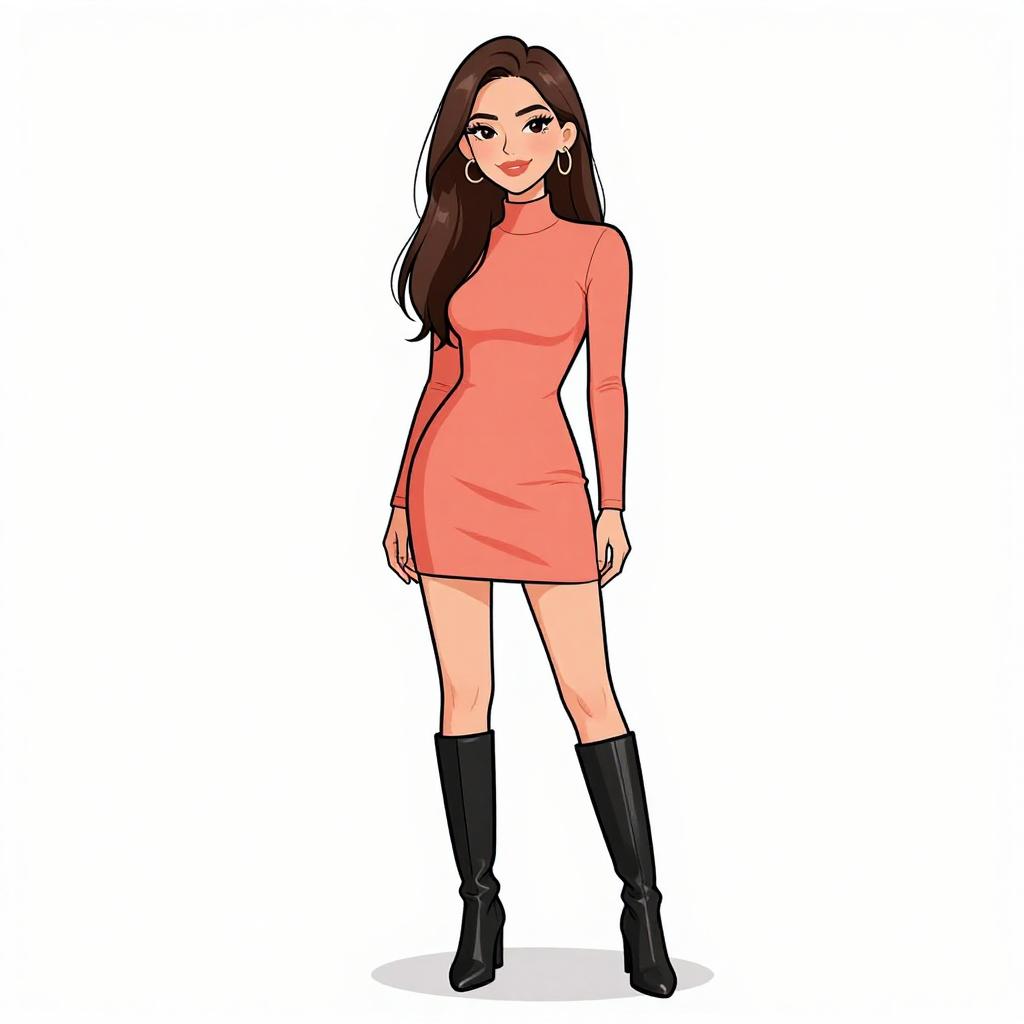 Woman with pretty face and pretty hair. smiling Woman, modern chic, black mini dress with white floral appliqué on the chest, high-necked, sleeveless, fitted silhouette, sheer black tights, classic black stiletto heels, plain white background. --sref 1467