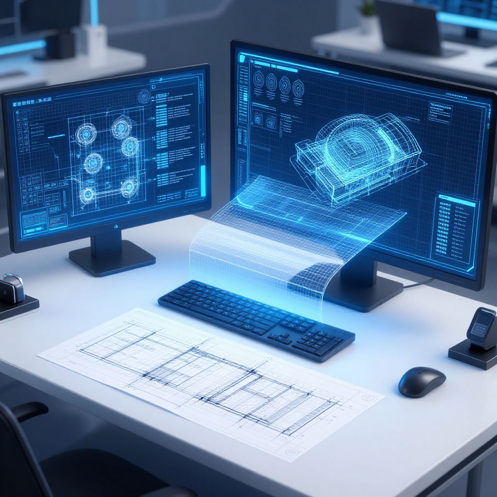 Convert blueprint to 3d model free, an engineer's desk with digital screens displaying blueprints morphing into fully rendered 3D models, sleek modern design, glowing blue and white tones, ultra-detailed technical environment with a hint of cyber aesthetics
