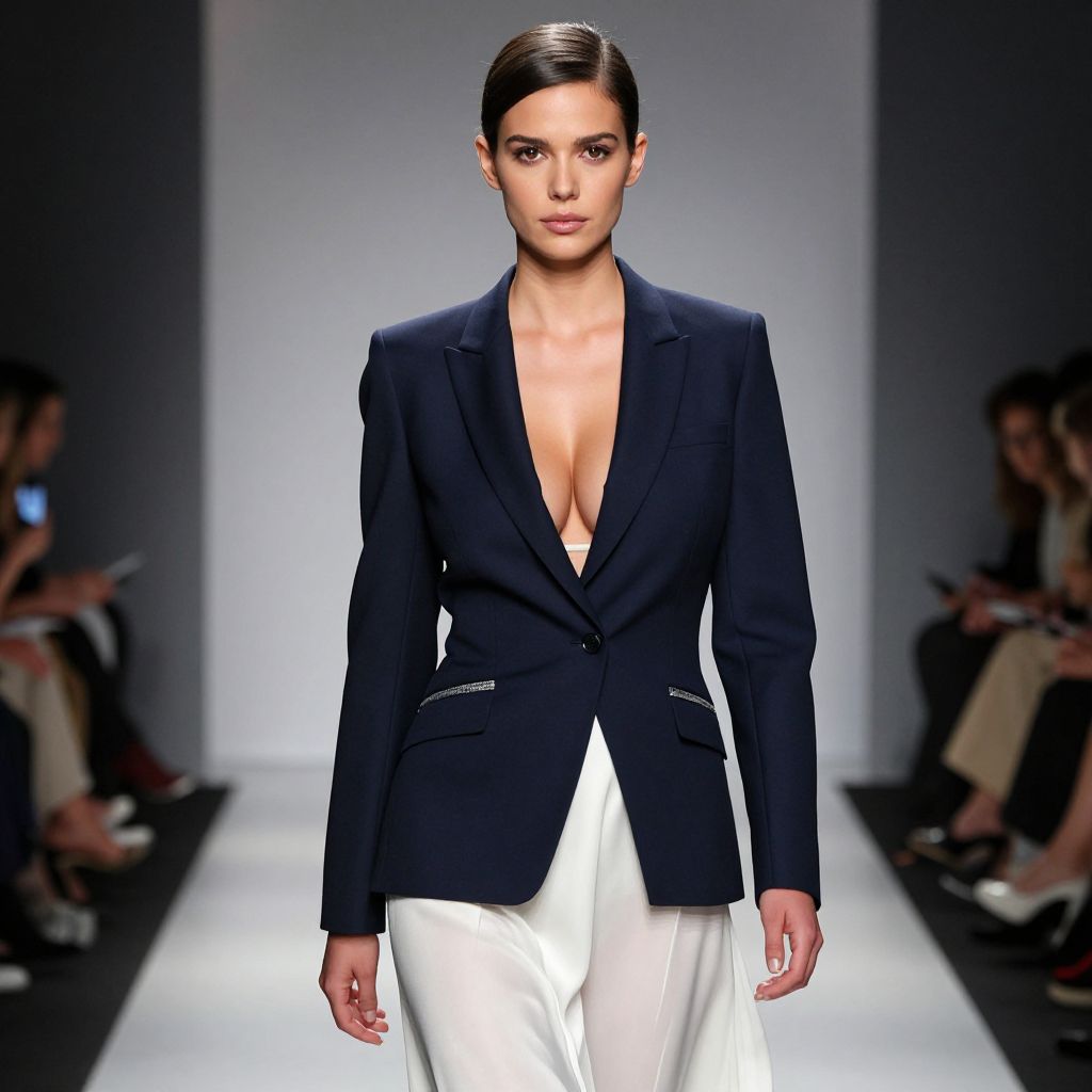 Photograph of a female model with fair skin and dark, slicked-back hair, walking down a brightly lit runway. She wears a deep navy blue blazer with a plunging neckline, revealing a hint of cleavage, paired with white, high-waisted trousers. Her expression is serious and focused. The background is blurred, featuring an audience seated on either side. The runway is white with a black edge, creating a stark contrast. The overall style is modern and minimalist, emphasizing professional and chic fashion.