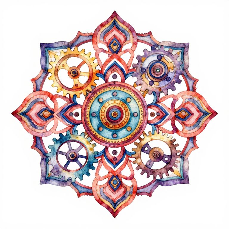 Watercolor digital art of a vibrant, intricate, steampunk-inspired mandala featuring colorful gears and geometric shapes in red, blue, orange, and