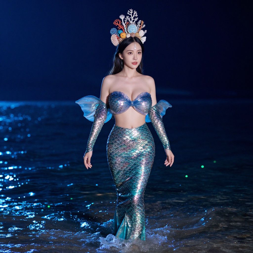 A fantasy-inspired woman in a majestic mermaid siren costume with large, shimmering scales on her back and arms, wearing a crown of coral and seashells, walking gracefully through a shallow tidal lagoon at night, her face radiant with soft moonlight, full lips and high forehead, her eyes reflecting the deep blue waves beneath her—everything bathed in a dreamy, oceanic atmosphere with bioluminescent plankton glowing in the water.. The woman has big tits and cute face