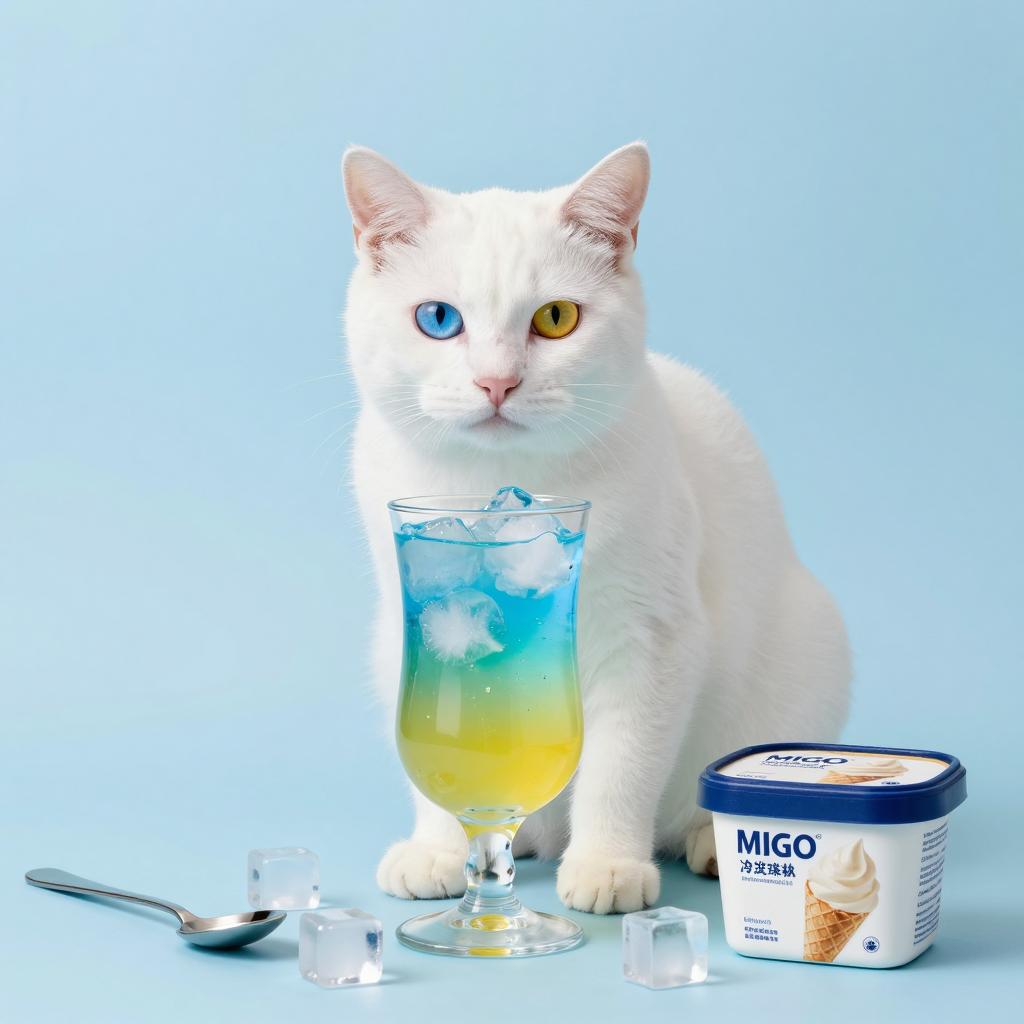 White cat with heterochromia, one blue eye, one yellow eye, sitting in front of a colorful drink glass, ice cubes, and a boxed ice cream pack. Drink glass has blue, yellow, and green gradients. Cat's body centered, head facing forward. Ice cubes scattered on a light blue surface. Spoon on the left, boxed ice cream on the right. Bright, clean background.