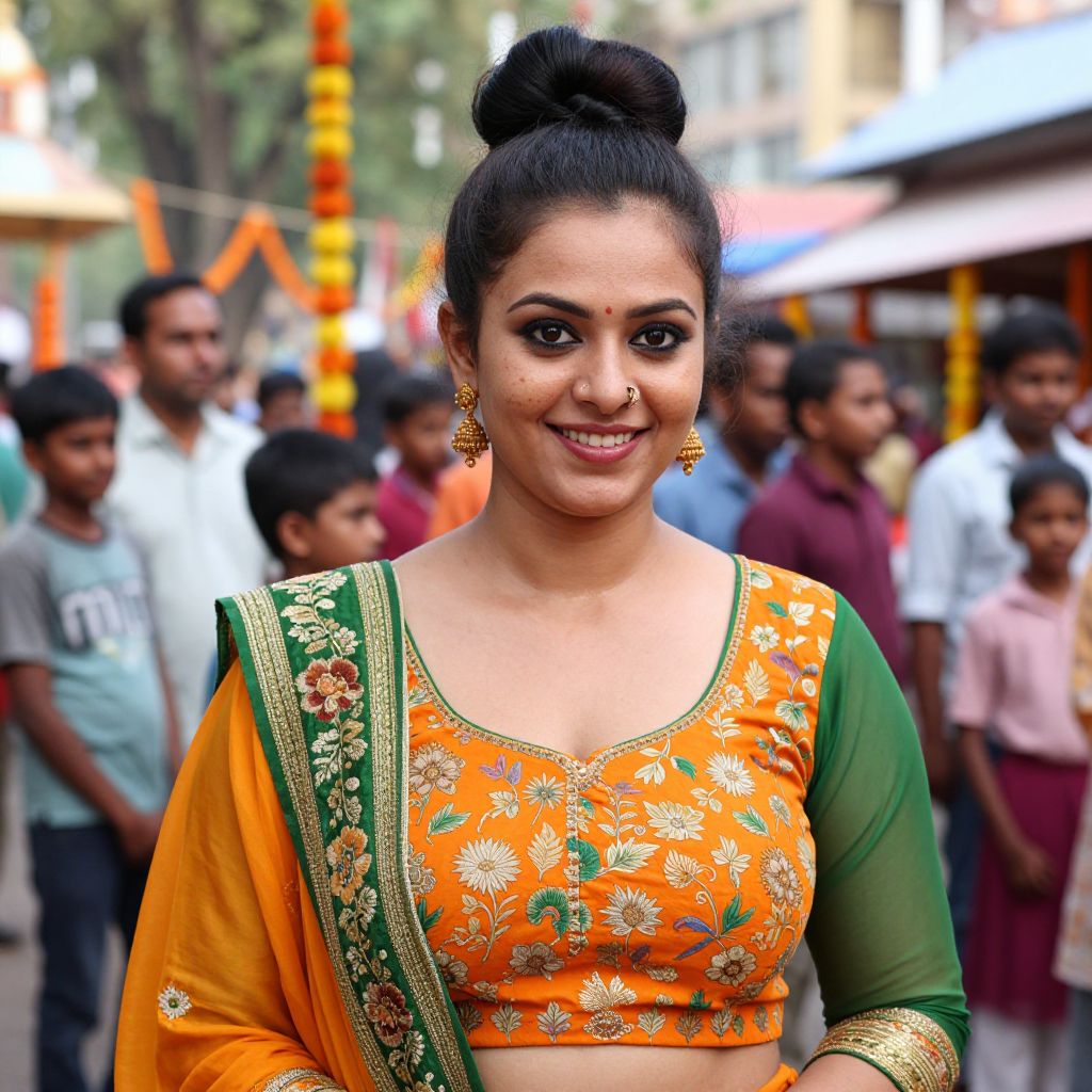 Photograph of an Indian woman with a stylish, hand-tied bun Indian hairstyle, wearing a vibrant orange and green regional costume with floral patterns, standing in a lively temple festival in Chennai, her face has a joyful expression with freckles and dark brown eyes, surrounded by children and celebratory decorations.. The woman has big tits and cute face