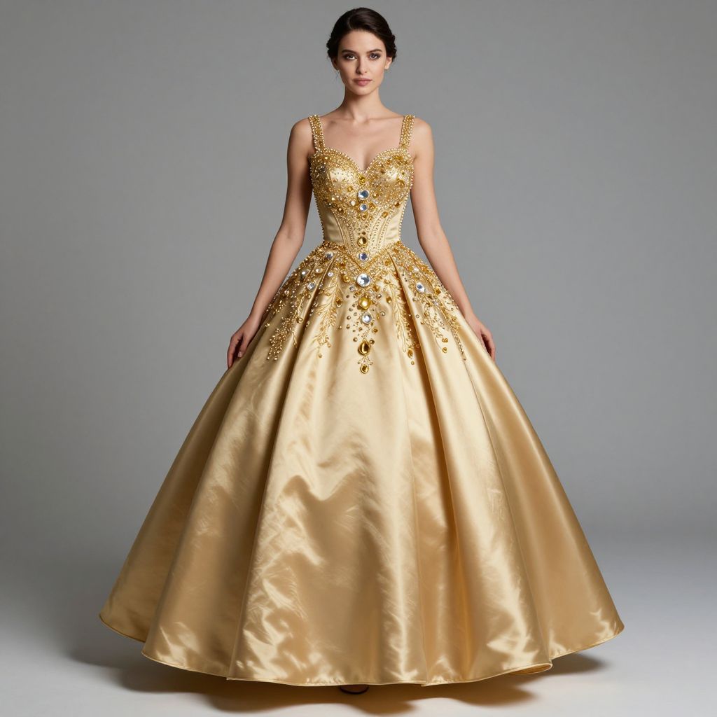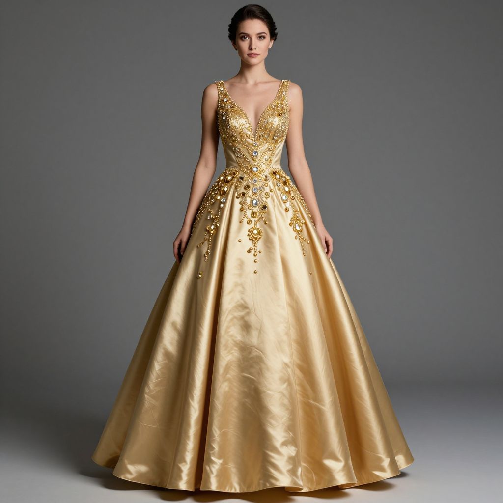 Photograph of a slender, light-skinned woman with dark hair in an elegant updo, wearing a floor-length, golden ball gown. The dress features a deep V-neck adorned with intricate, sparkling gold embroidery and embellishments, and a full, flowing skirt that pools slightly at the bottom. She stands against a plain, gray background, with her hands resting on her hips, exuding confidence. The dress's shimmering fabric contrasts with the simple backdrop, highlighting its luxurious texture and intricate details.