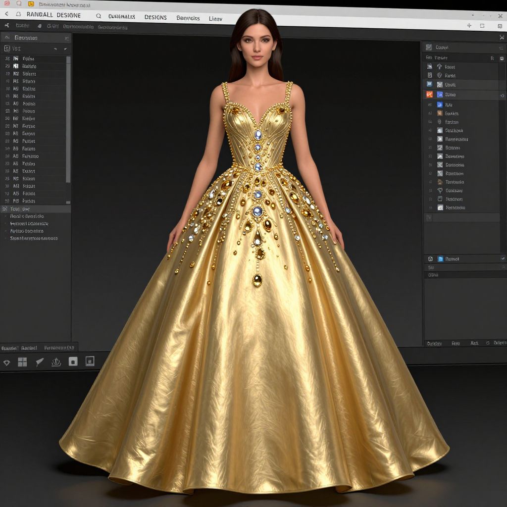 A woman elegantly poses in a high-definition, iridescent gold silk ballgown adorned with intricate gold and AB rhinestone embellishments, showcasing a blend of luxury and sophistication in a refined, computer-generated fashion presentation by Randall Designs.