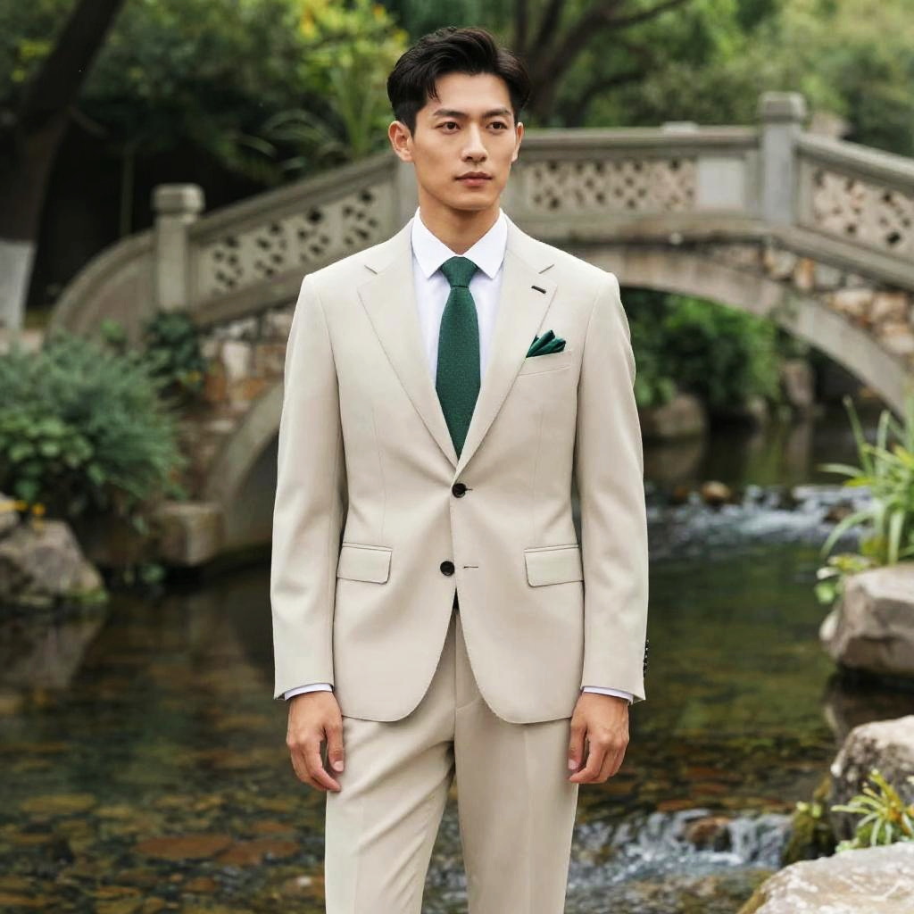 Photograph of a young Asian man with short black hair, standing in front of a stone arched bridge over a small, flowing stream. He is wearing a crisp, light beige suit with a white dress shirt and a dark green tie. A pocket square in a matching beige is neatly tucked into his jacket's breast pocket. The background is lush with greenery, and sunlight filters through the trees, casting a natural, serene light on the scene. The man's expression is neutral, and he stands with his hands by his sides. The overall setting is calm and elegant.