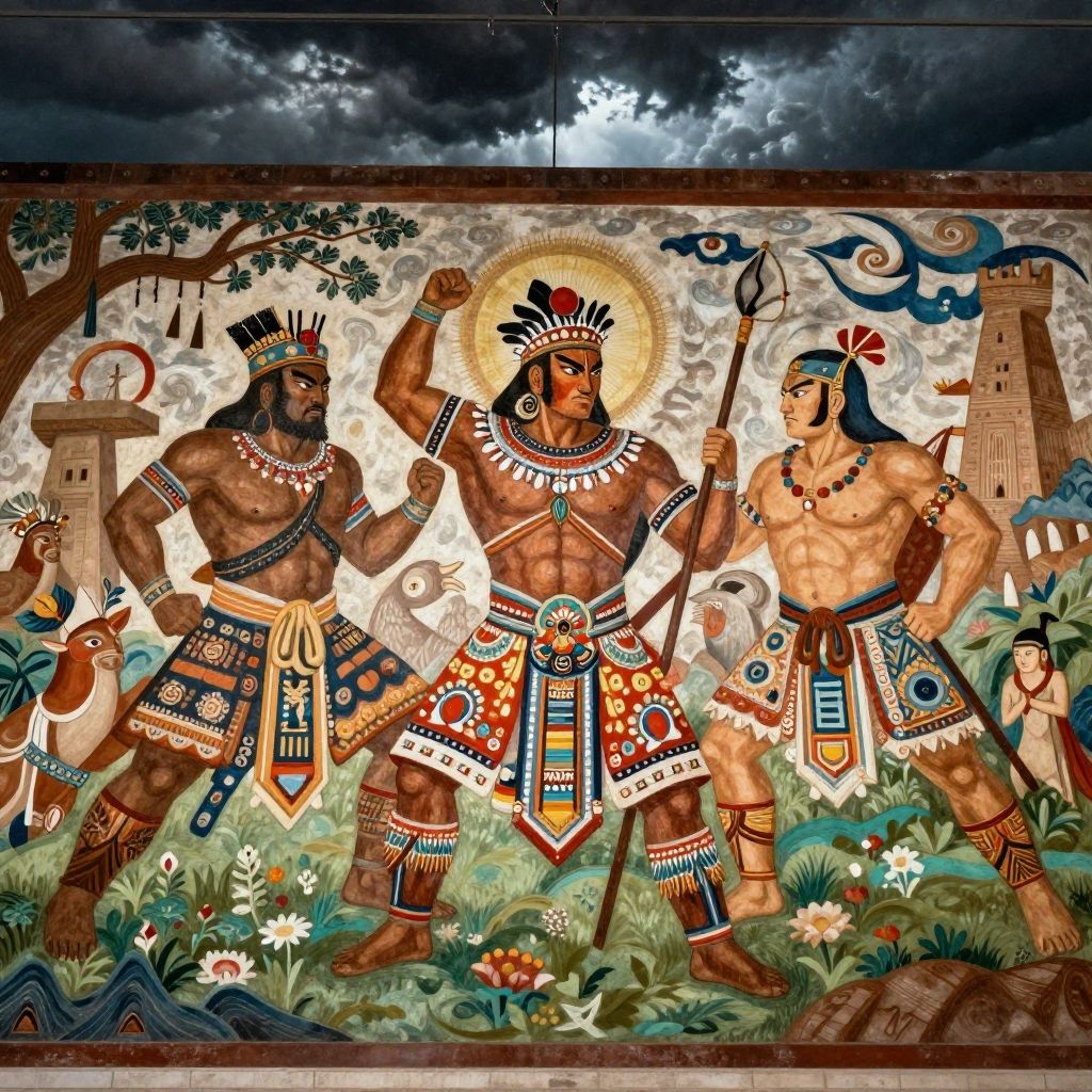 Vivid mural of three muscular, dark-skinned Aztec warriors with colorful headdresses and ornate clothing, standing against a dramatic cloudy sky.