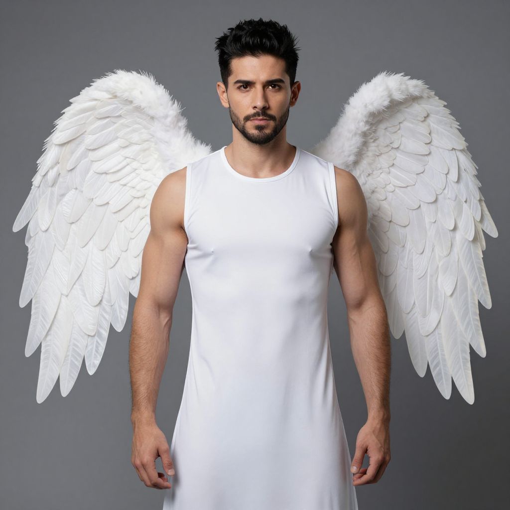 Photograph of a muscular, bearded man with short black hair wearing a white sleeveless tunic. He has large, detailed white feather wings on his back. The background is a solid gray, highlighting the subject. The man's expression is serious, and he stands with his arms slightly away from his body. The white tunic and wings contrast sharply with his darker skin tone, giving a celestial, angelic appearance. The lighting is even, emphasizing the textures of the feathers and the smoothness of the tunic.